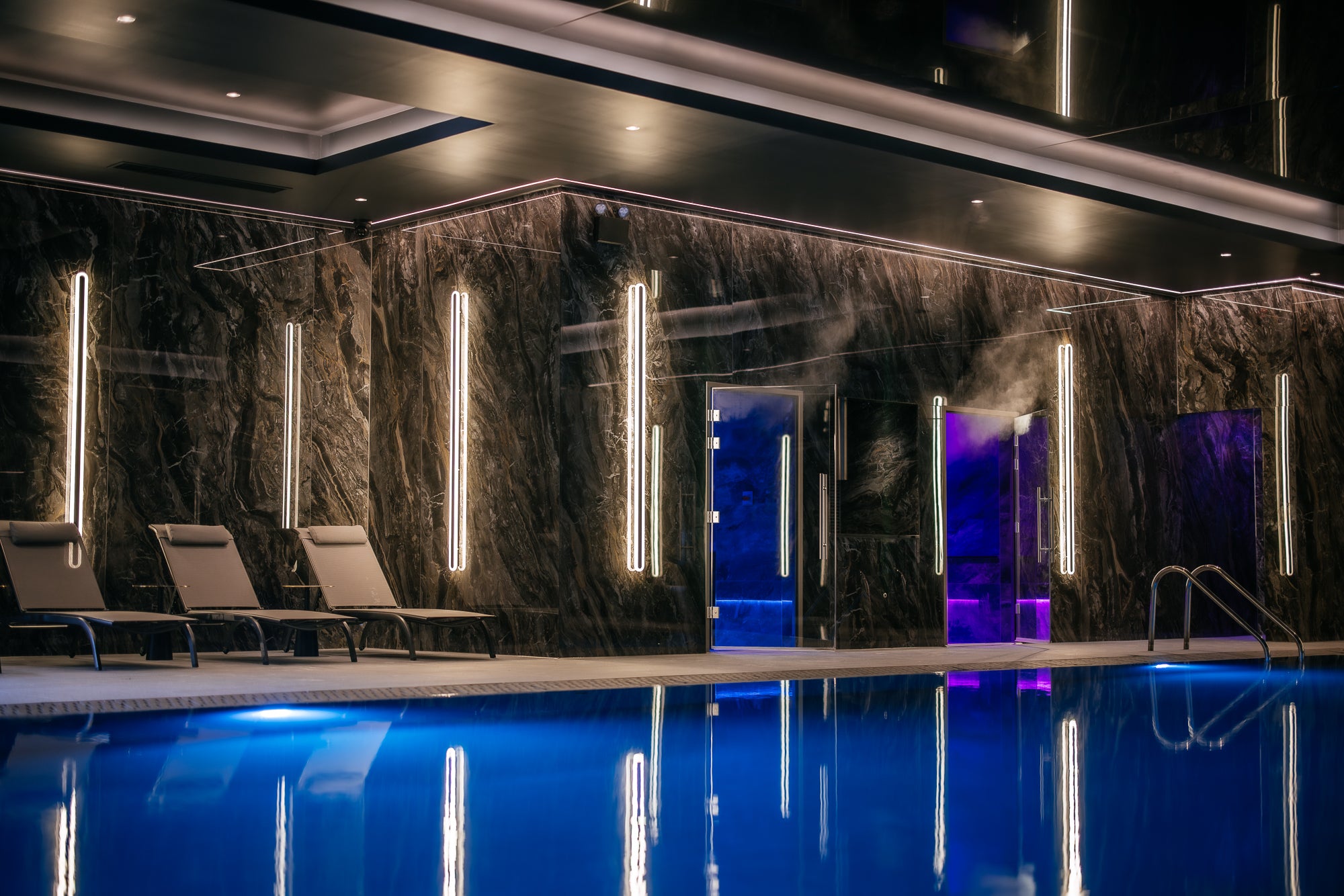 Custom waterproof luminaires were manufactured to SELV standards and engineered for continuous moisture exposure, chemical treatment and elevated temperature environments. Careful consideration was given to Kelvin colour temperature and rendering, lumen output and indirect diffusion to ensure both photometric performance and visual comfort throughout the spa journey.
