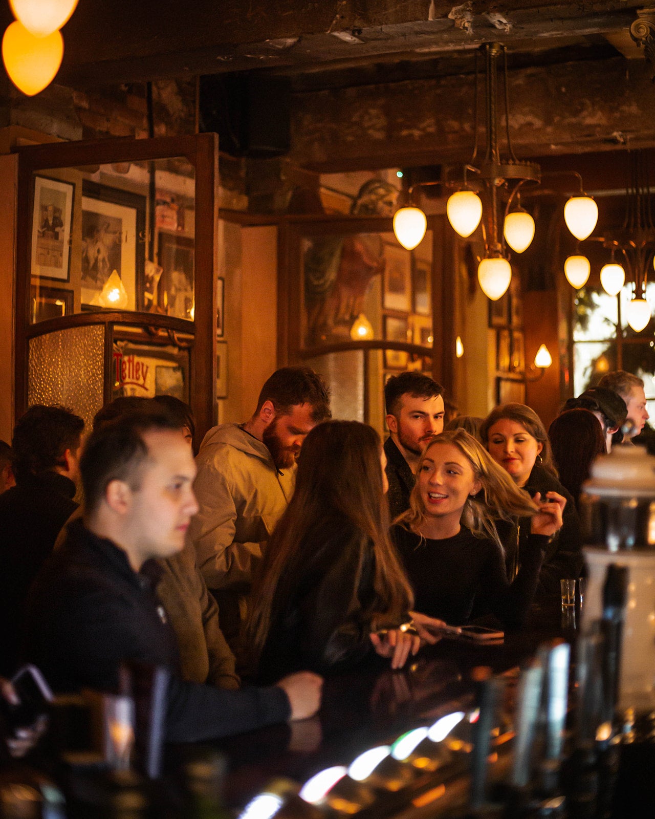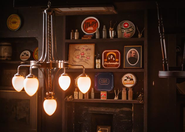 A coordinated scheme of heritage-style feature pendants and decorative wall lighting was specified throughout the venue. Statement multi-arm chandeliers with opal glass shades provide soft, diffused ambient light, while wall lights add secondary layers to support artwork, vintage signage and perimeter seating zones. Together, the fittings create a cohesive, period-appropriate atmosphere without glare, balancing visual comfort with the practical requirements of a busy hospitality setting.