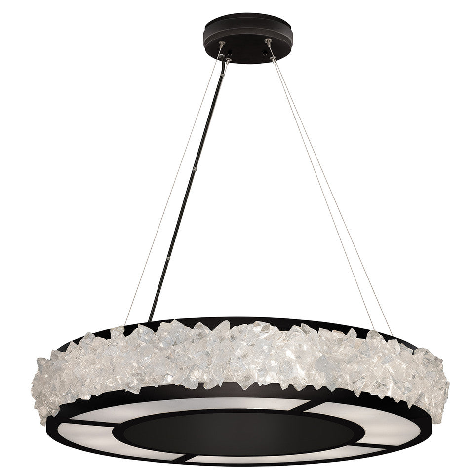 Using thousands of handmade “rough-cut” crystal gems, Arctic Halo by Fine Art Handcrafted Lighting celebrates the refracted light of ice crystals carried by cirrus clouds and forming a lunar halo in the night sky. Drums and rings with tightly woven white fabric diffusers.