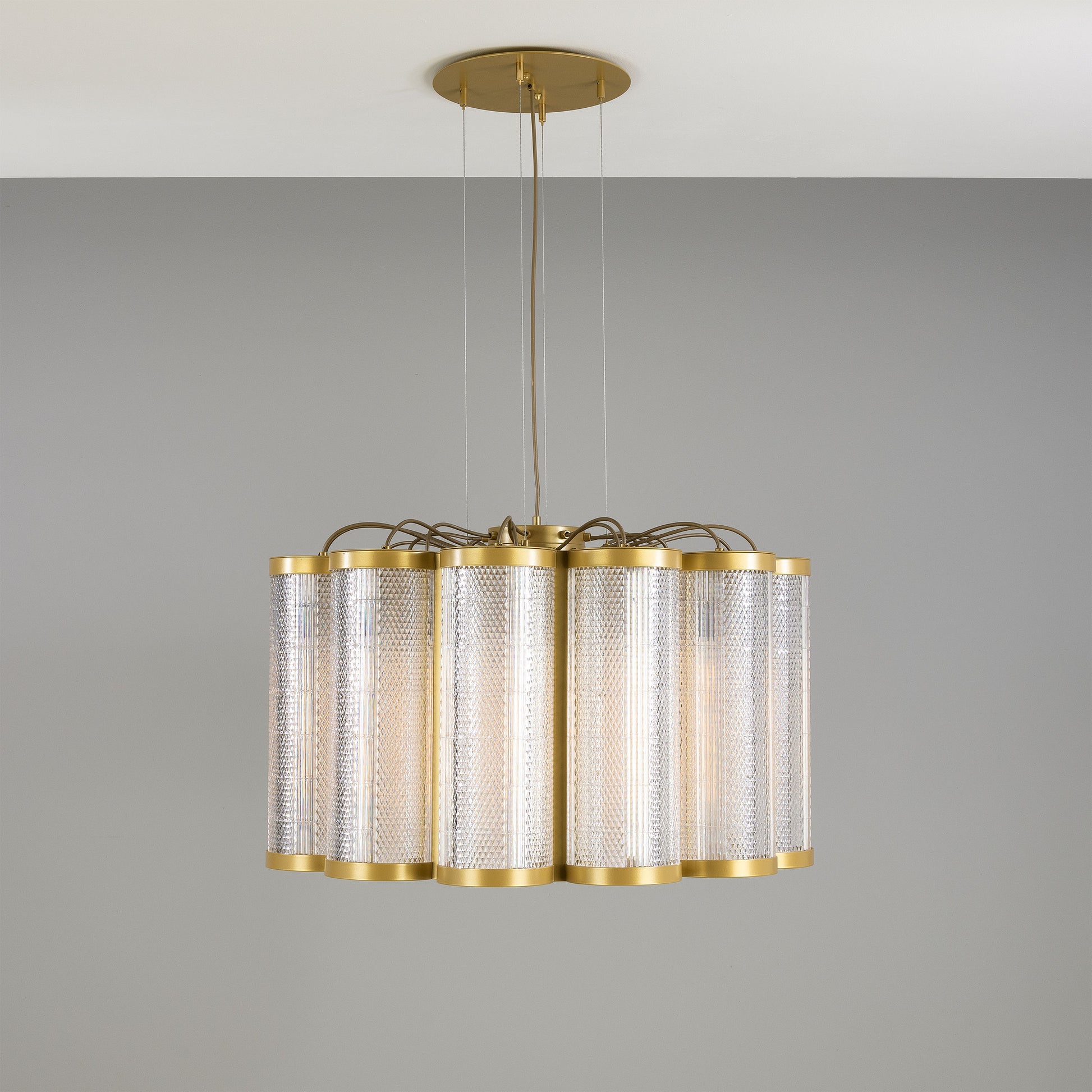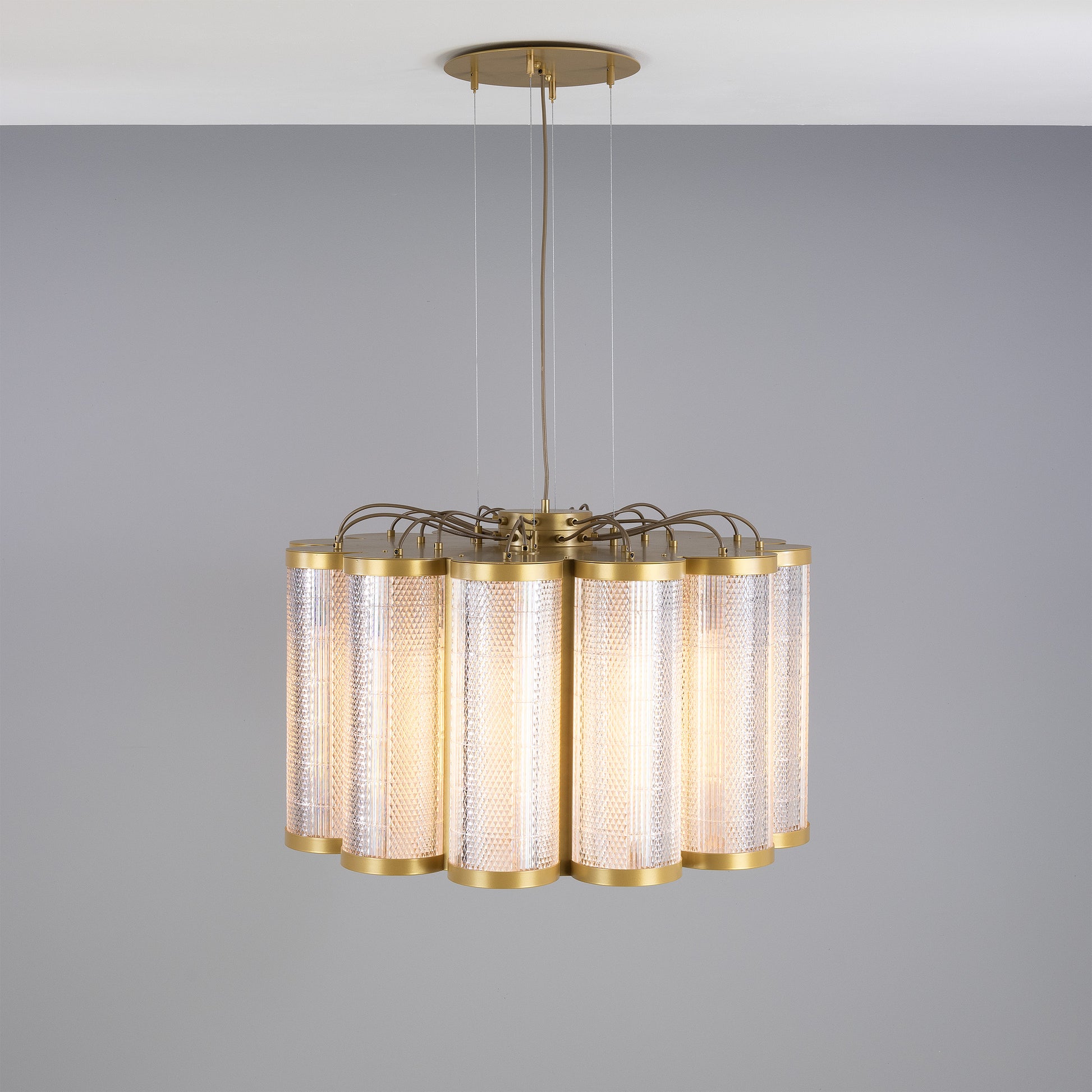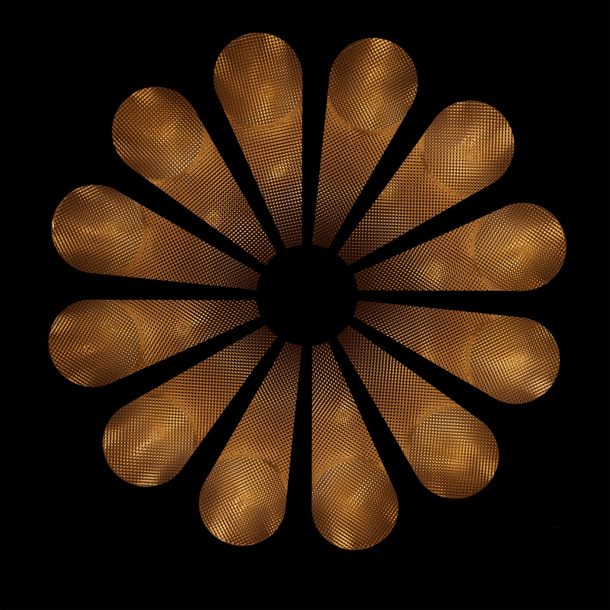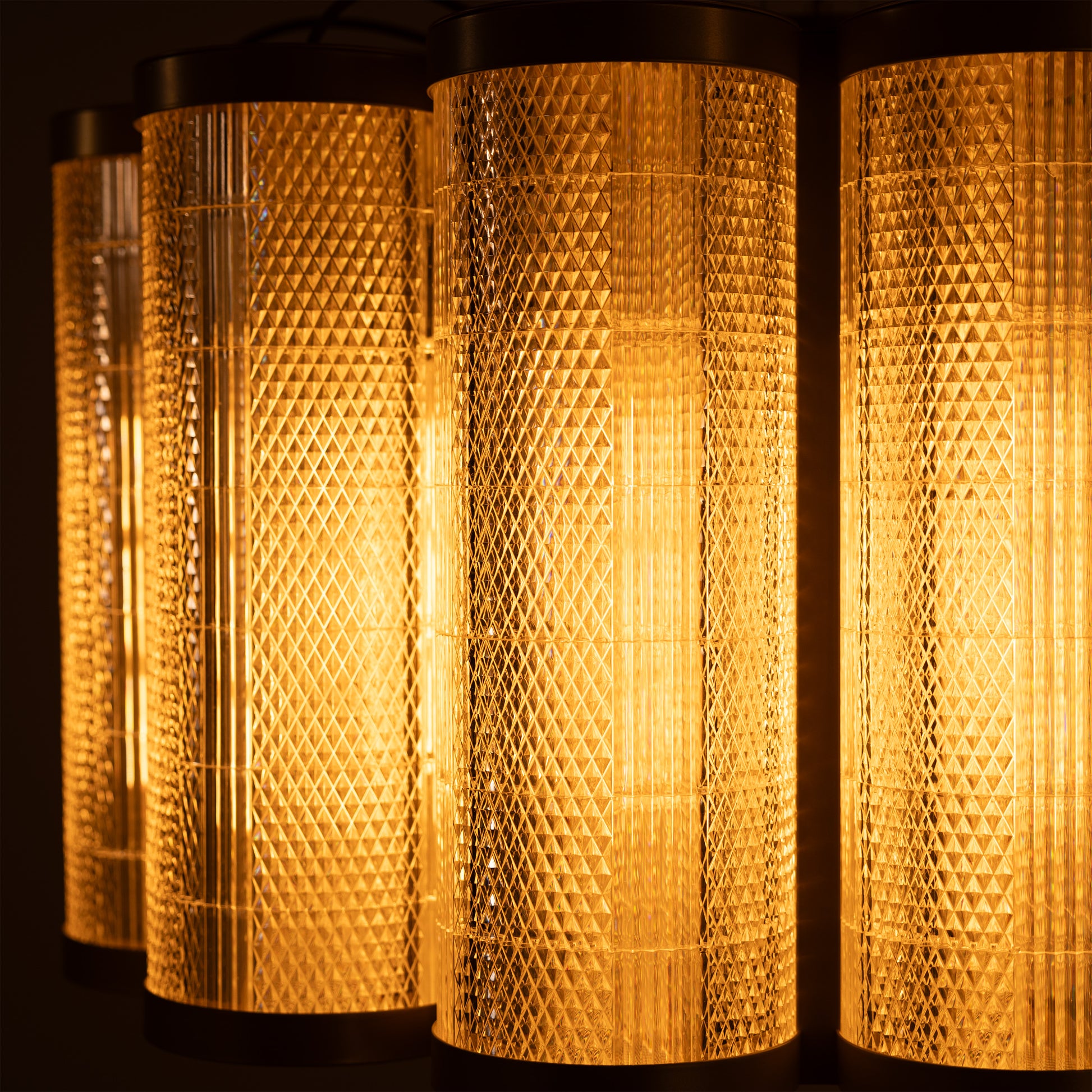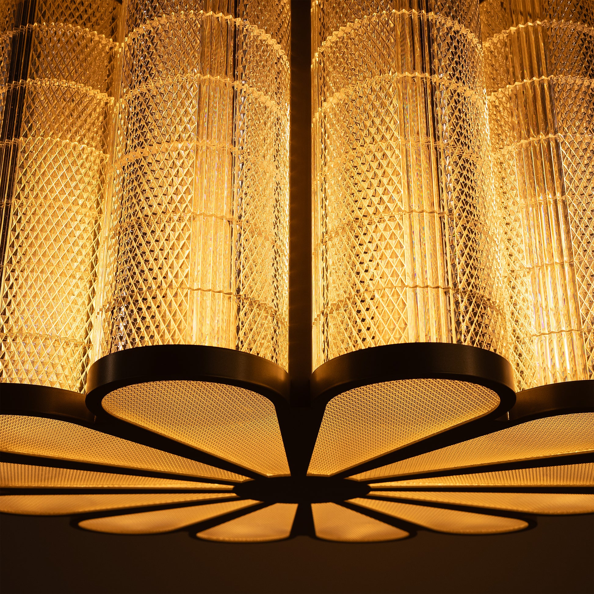 Composed of twelve curved acrylic segments, each piece is patterned with prismatic diamonds and vertical ridges to diffuse and refract the light beautifully. When illuminated, the chandelier casts a warm, dappled glow with a floral silhouette from below. A powder-coated frame supports the structure, available in gold, bronze, or matte black to suit a variety of interior styles.