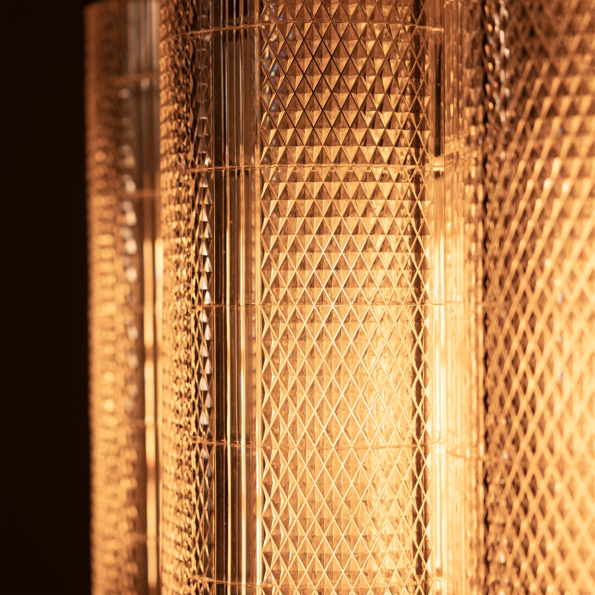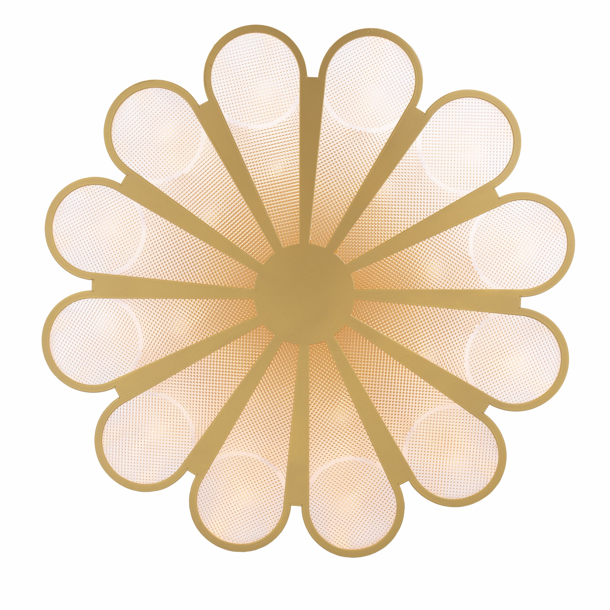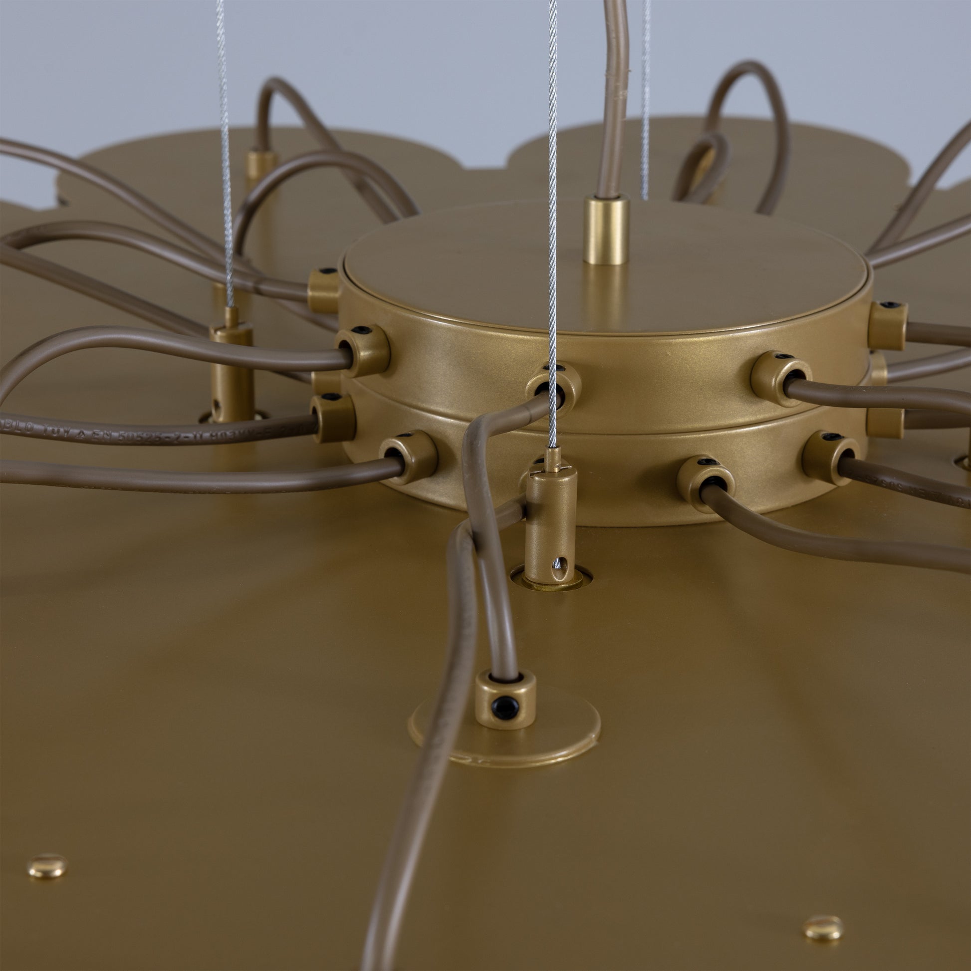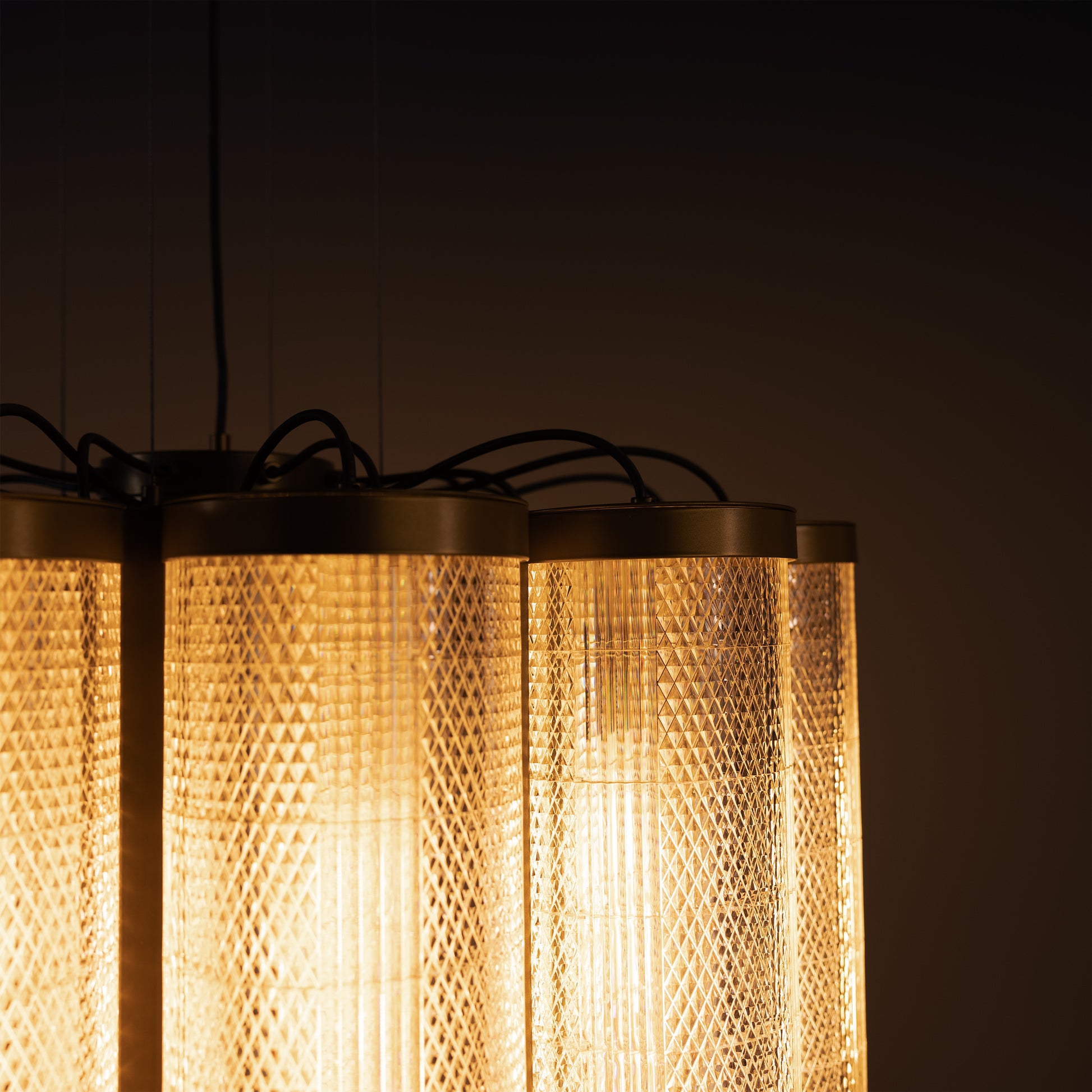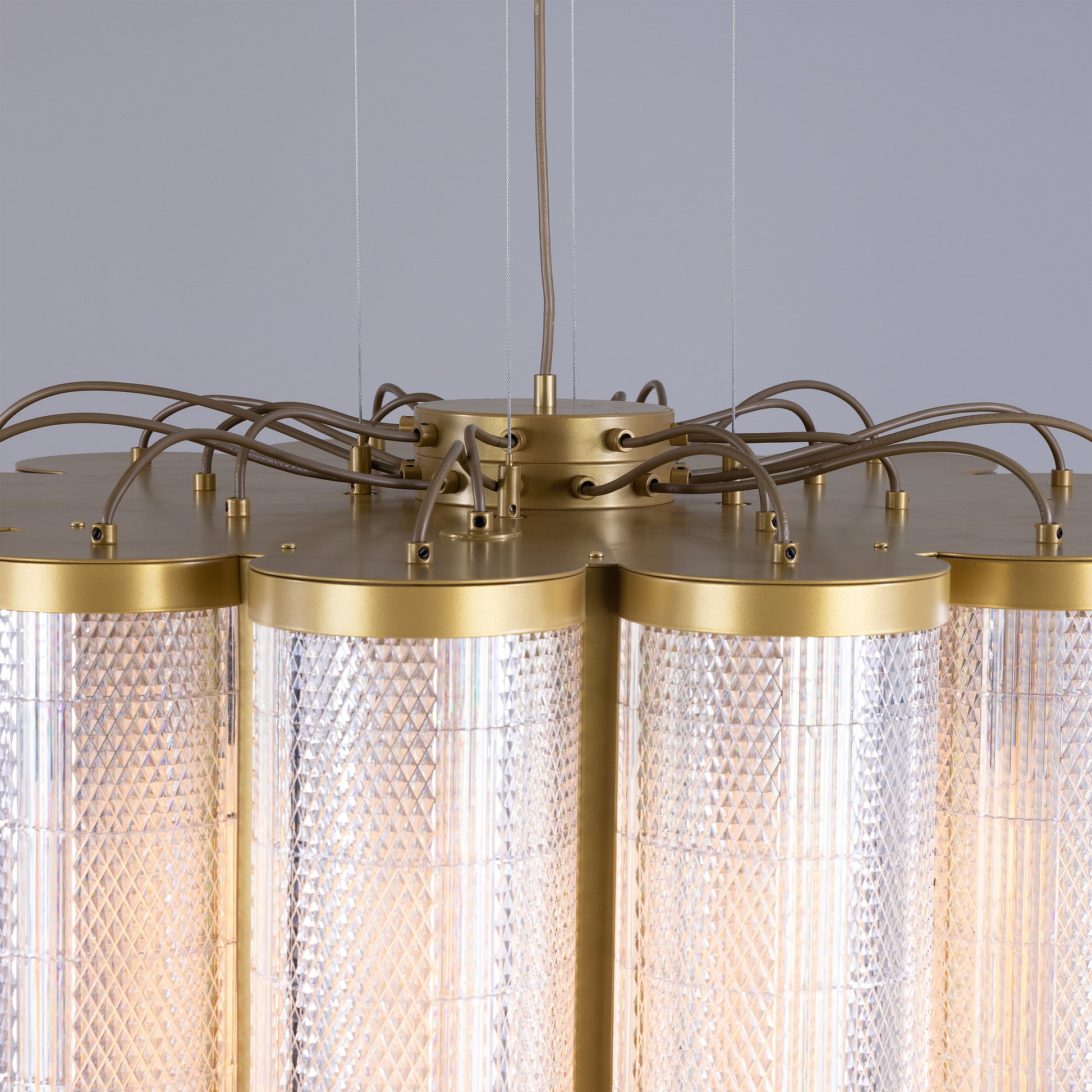 Composed of twelve curved acrylic segments, each piece is patterned with prismatic diamonds and vertical ridges to diffuse and refract the light beautifully. When illuminated, the chandelier casts a warm, dappled glow with a floral silhouette from below. A powder-coated frame supports the structure, available in gold, bronze, or matte black to suit a variety of interior styles.