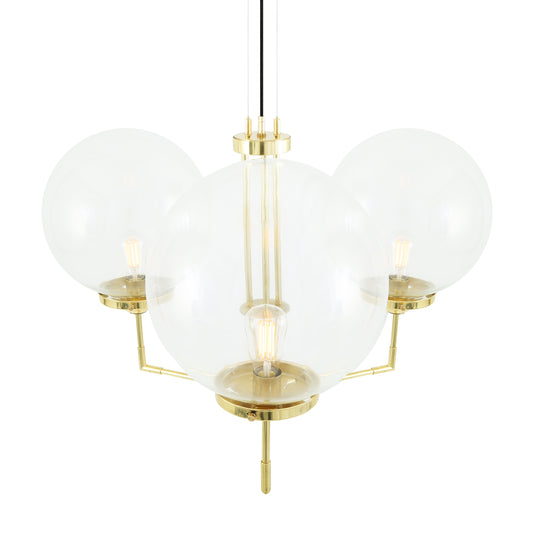 Each arm protrudes horizontally first then vertically at right angles to support a globe glass lamp shade. Its modern structure contrasts with its globe opal glass shades that cast soft light over a large area.