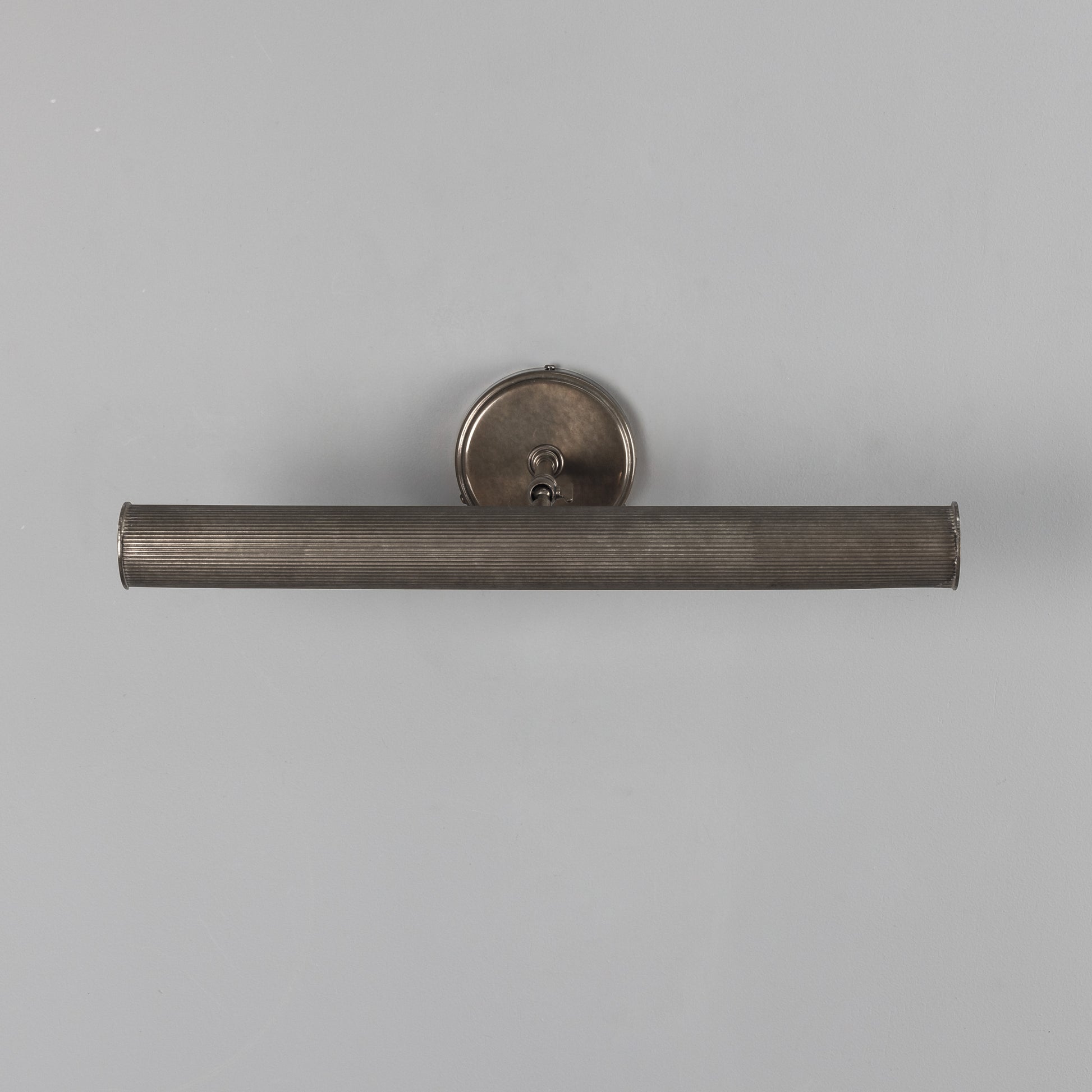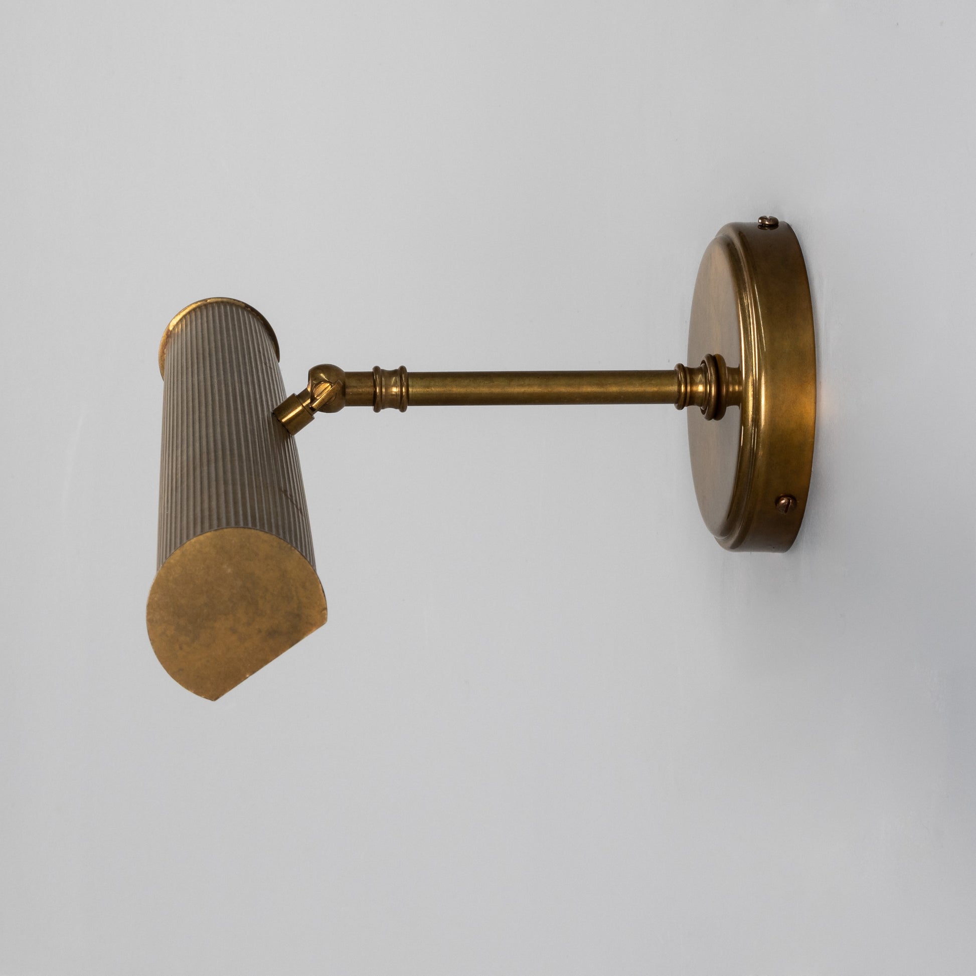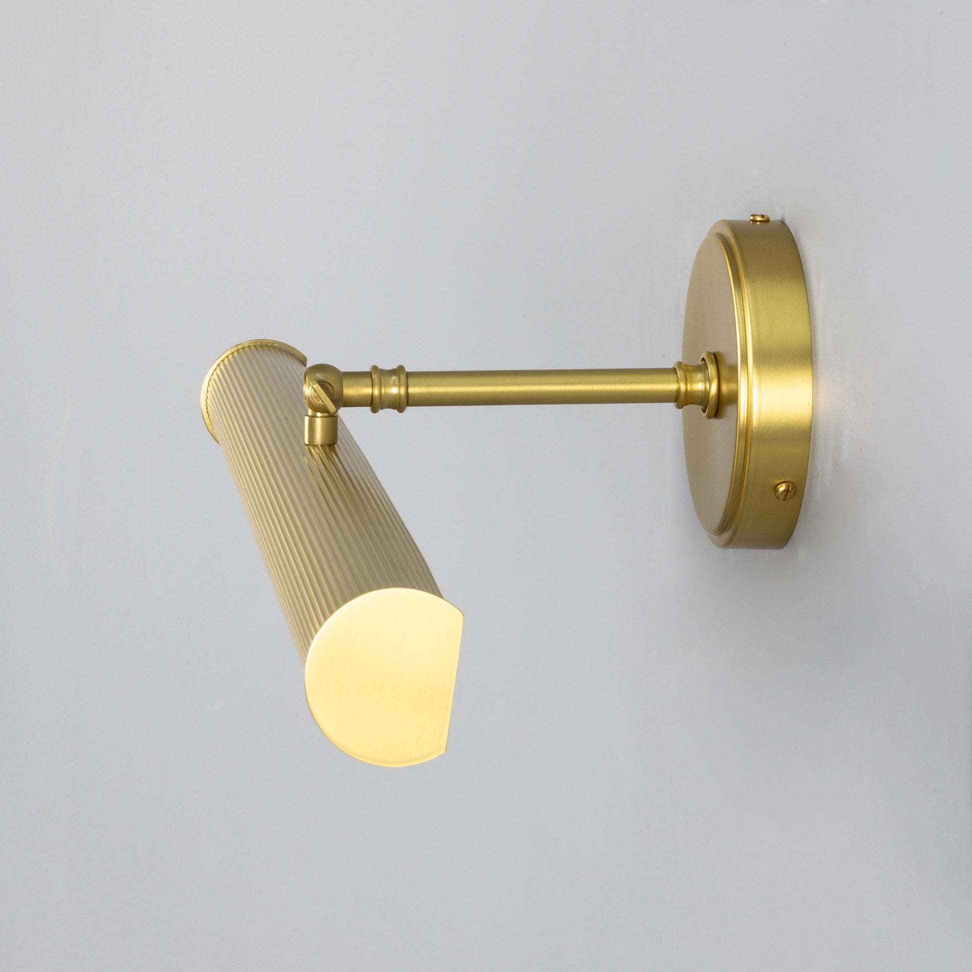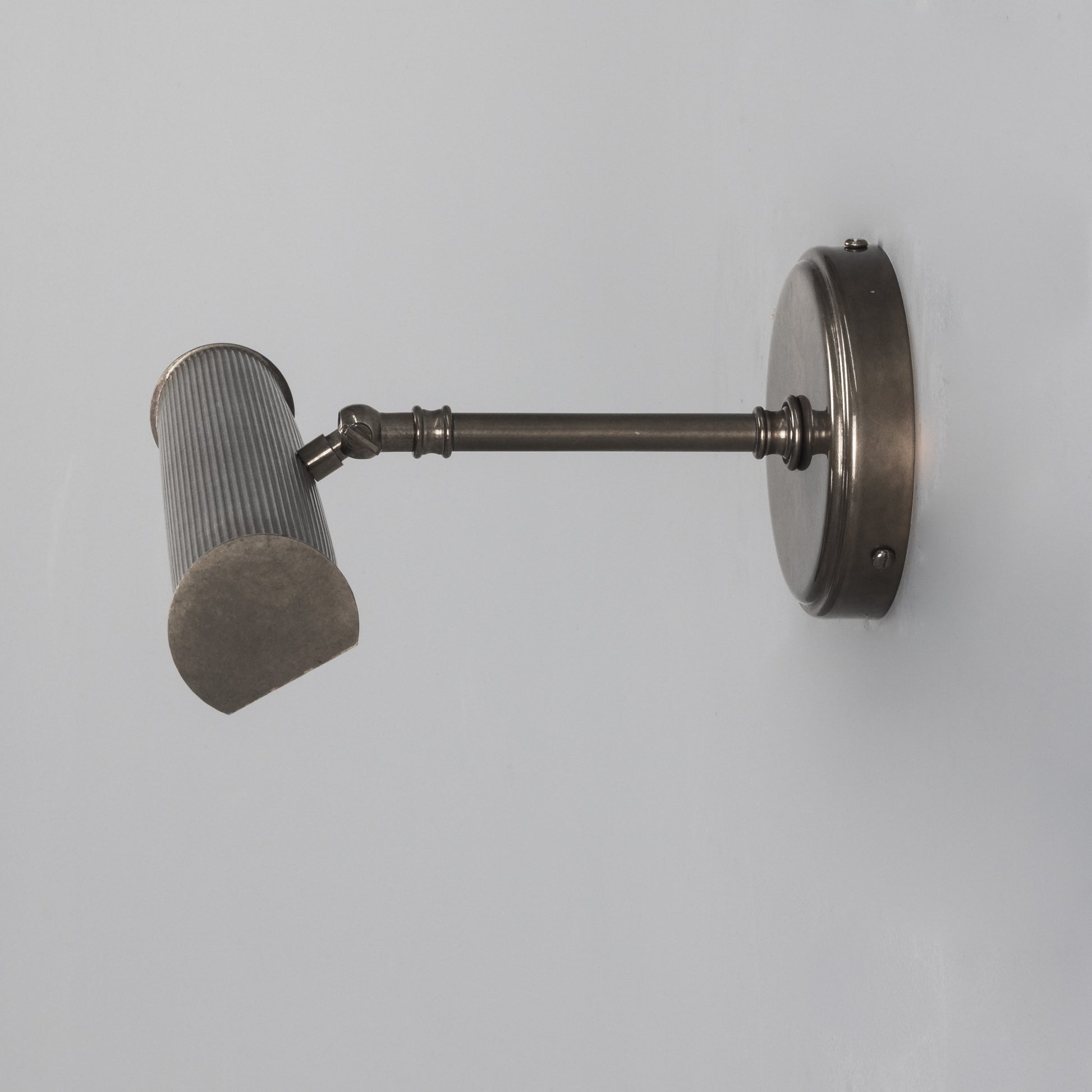 Available in 35.5cm and 50.5cm, this wall-mounted fixture features an adjustable joint that allows for directional light, ideal for illuminating artwork, photographs, or cabinetry. The reeded brass surface adds subtle texture, catching light in refined linear patterns, while the compact round backplate anchors the design with understated elegance. Available in a range of hand-finished brass tones including antique brass, polished brass, satin brass, matte black, gloss black and antique silver, the Bilbury blends functional adjustability with decorative appeal.