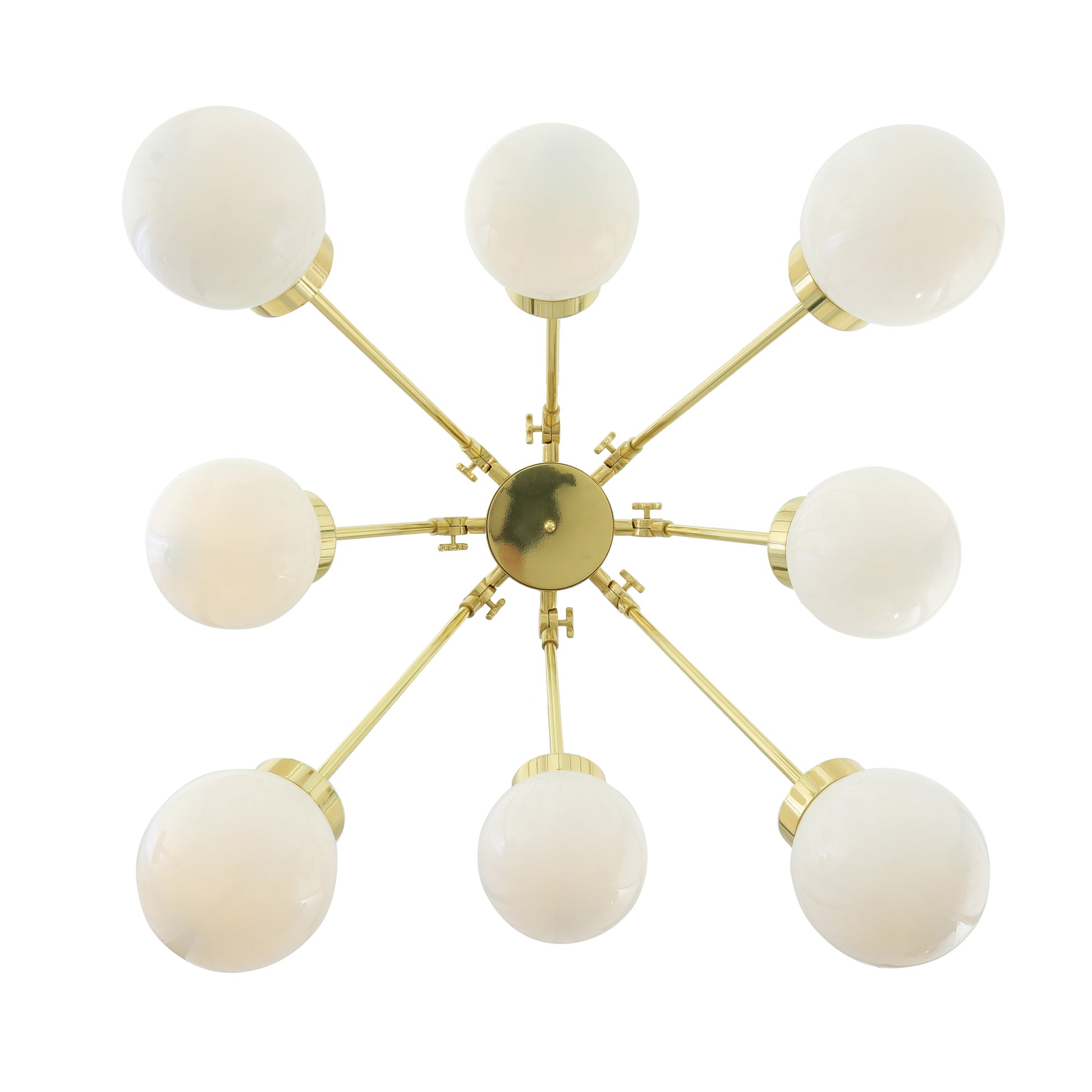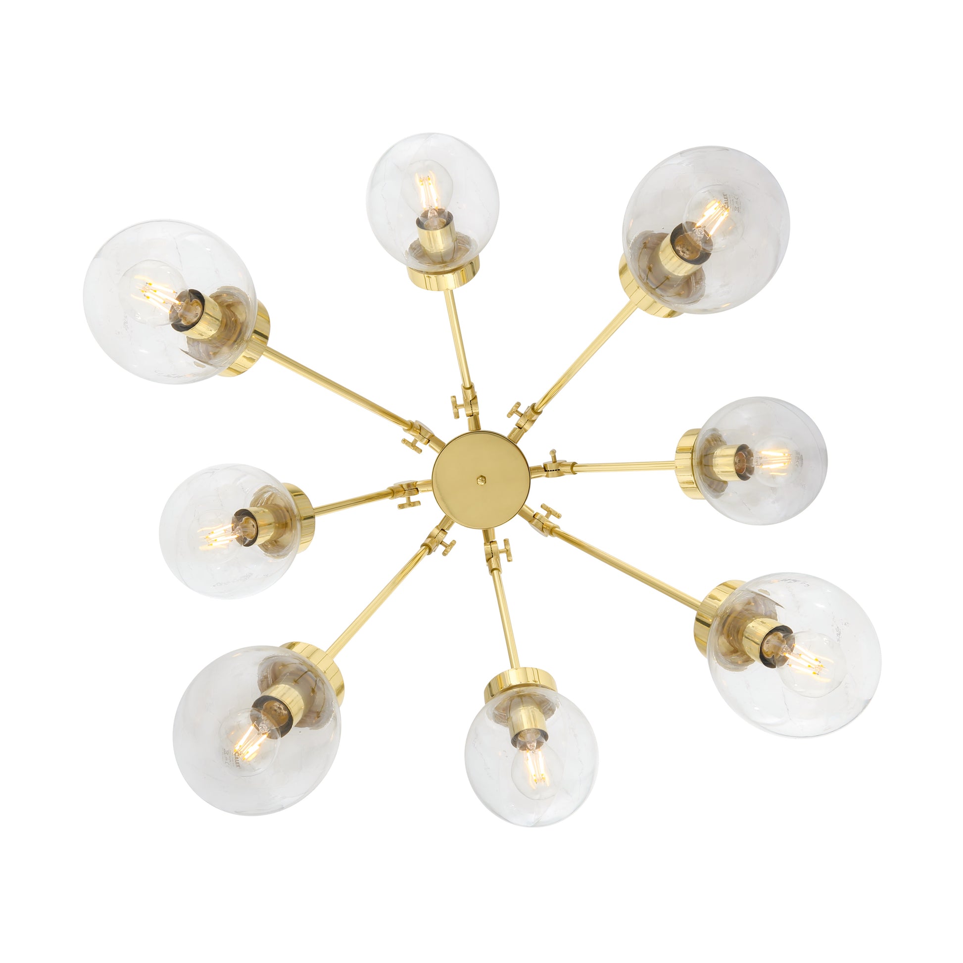 The Boho chandelier by Mullan Lighting is a striking contemporary chandelier that features eight brass arms radiating from a cylindrical centre. The brass arms alternate in length between 200mm and 350mm.