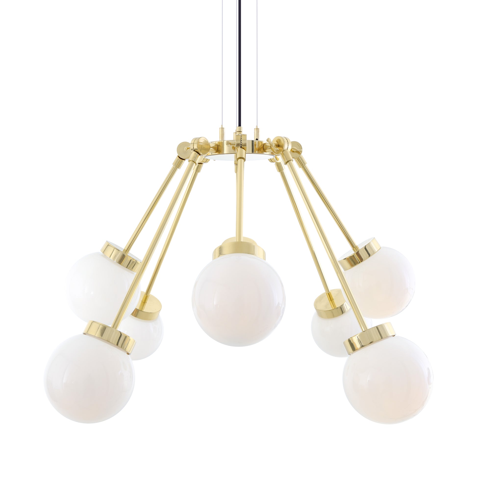 An adjustable swivel joint where each brass arm meets the Boho's cylindrical centre allows each arm to be adjusted up or down accordingly. This adjustment allows the Boho chandelier's diameter to increase from 460mm to 1400mm at its widest. The size of the chandelier's span can be adjusted to suit the proportions of its installed environment.