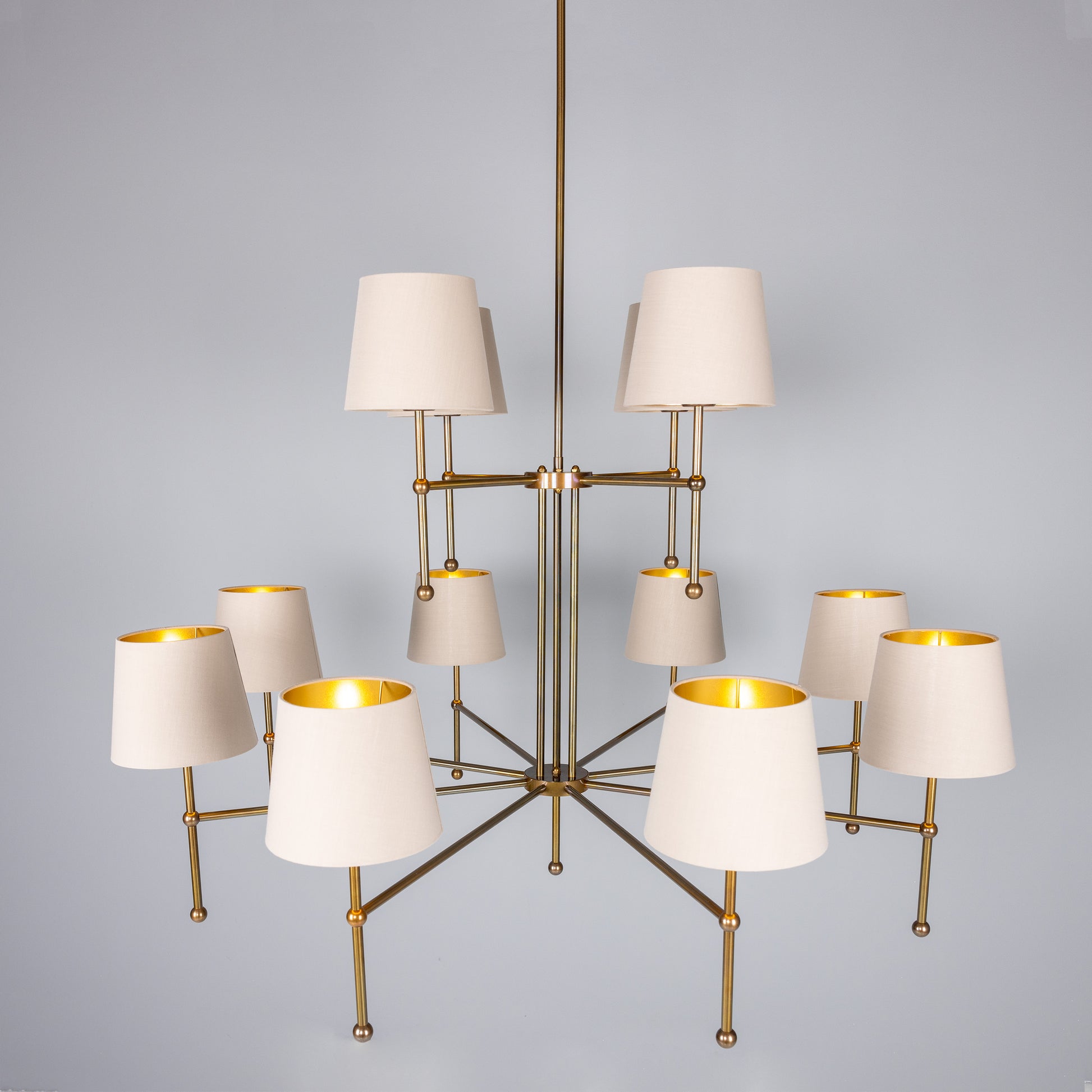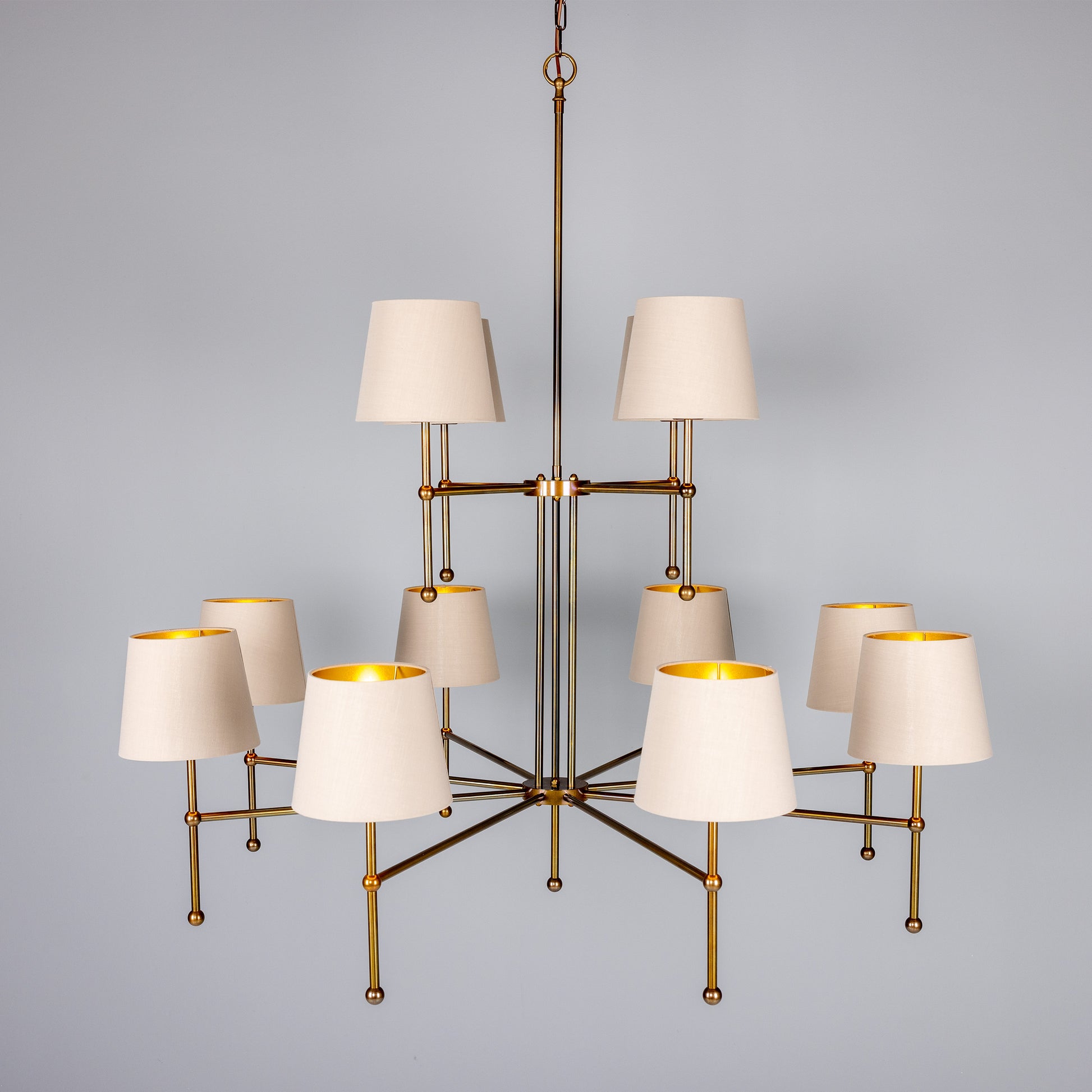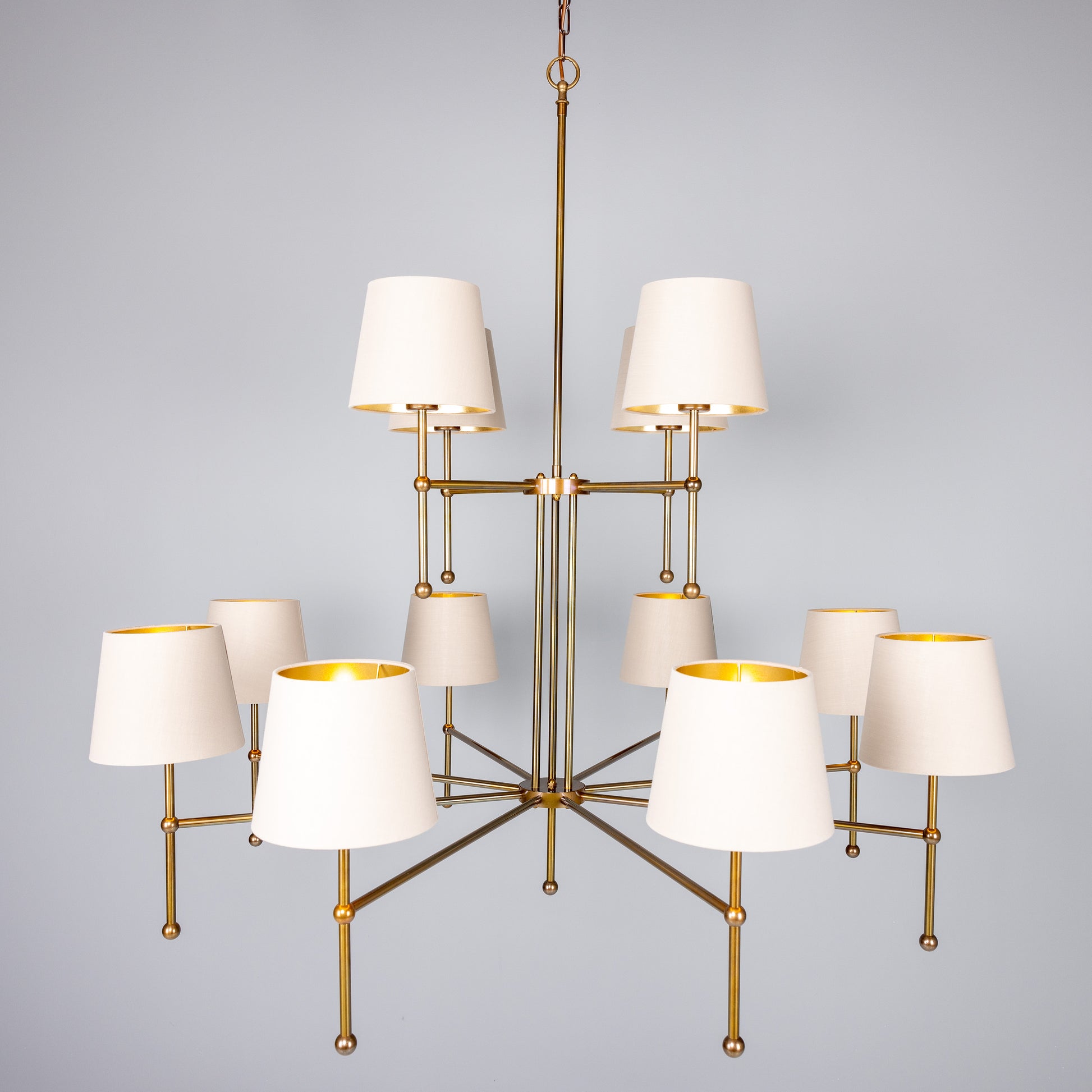 The California chandelier by Mullan is an elegant, modern chandelier with 12 lights, each supported by a brass arm.