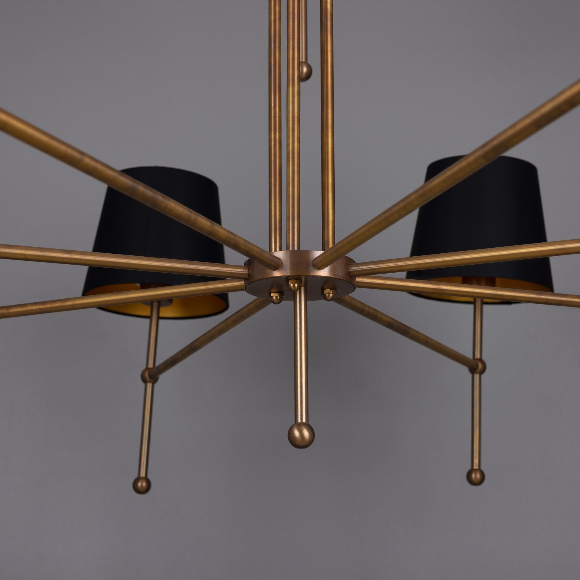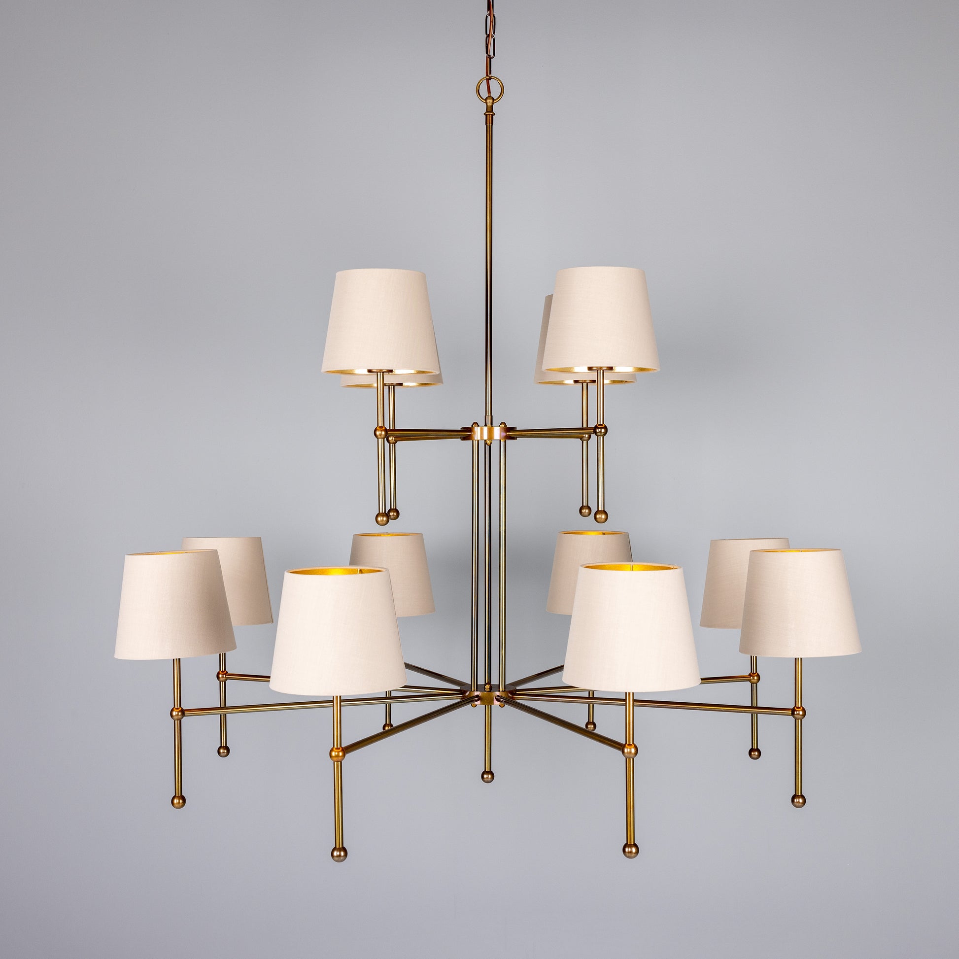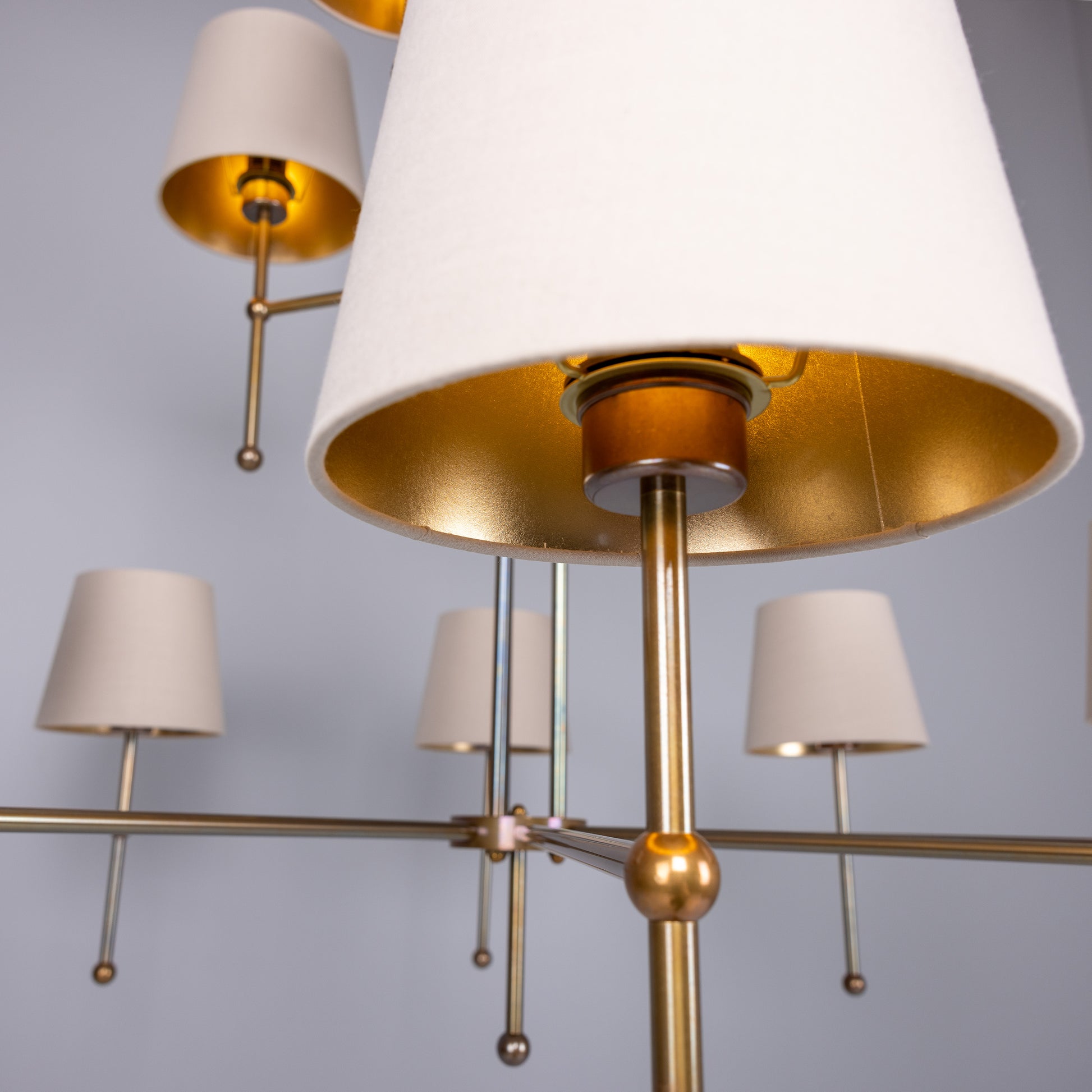 The California chandelier by Mullan is an elegant, modern chandelier with 12 lights, each supported by a brass arm.