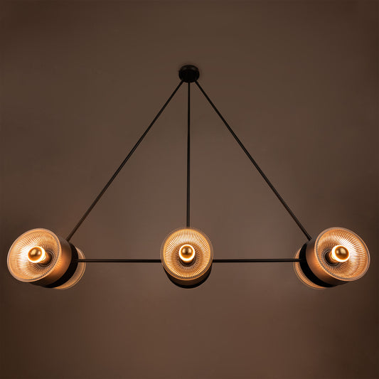 The brass discs behind each glass lamp shades are placed back-to-back, providing a warm but mysterious illuminance on each side of the chandelier's triangular frame.