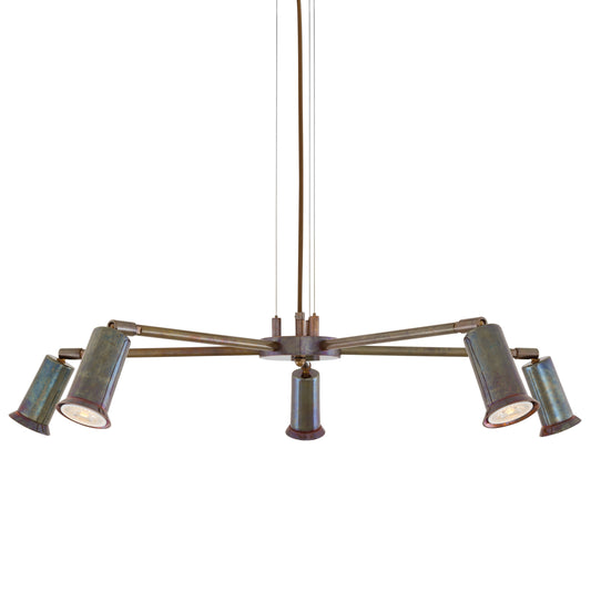 The Jasper chandelier is a contemporary chandelier by Mullan Lighting that features five brass arms radiating from a brass centre. Each arm has an adjustable swivel joint allowing the cylindrical brass shades of this fixture to be adjusted up or down.
