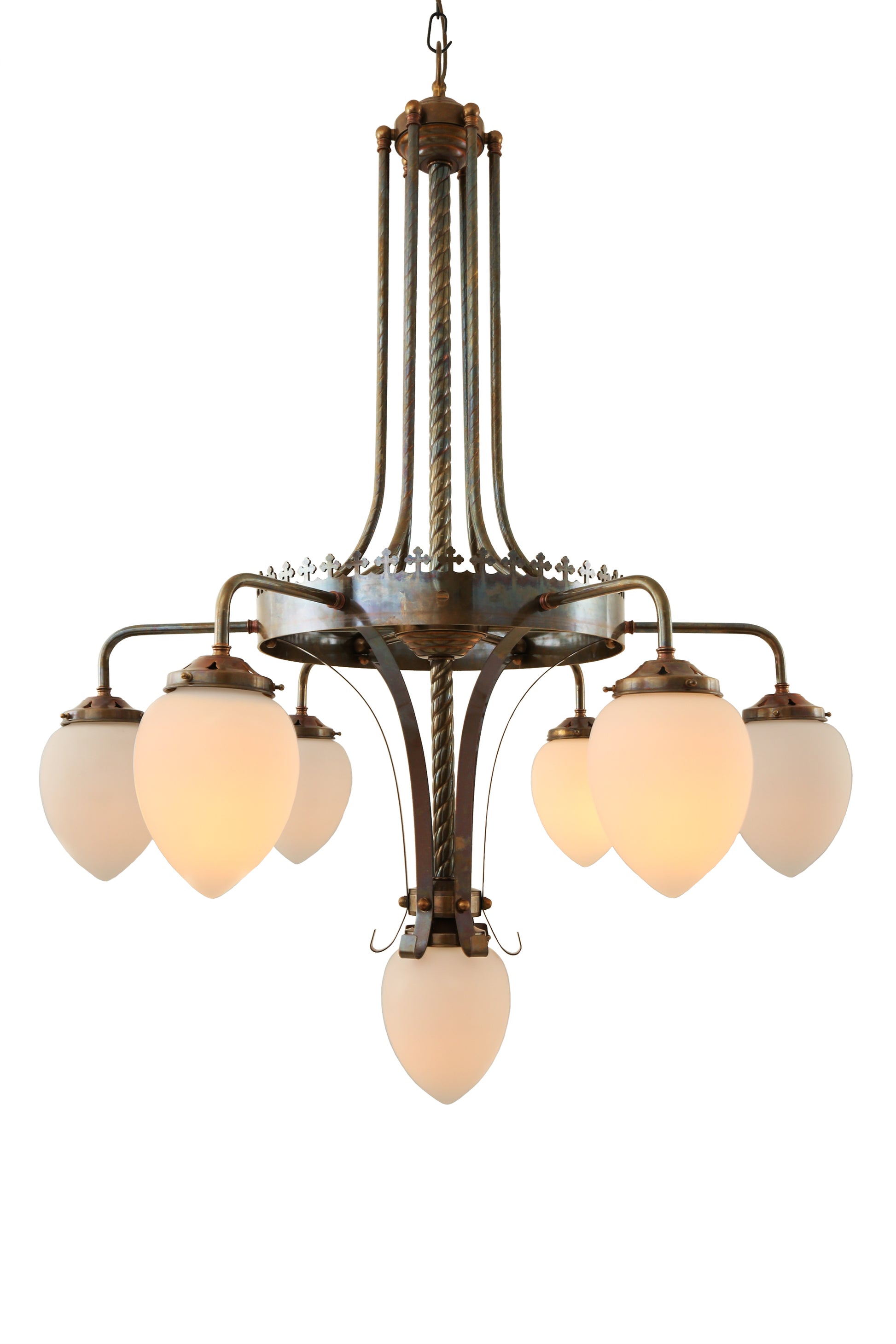 The Killarney chandelier by Mullan Lighting is an ornate, traditional chandelier ideally suited to churches and grand hotels. This solid brass chandelier features six arms and seven lights with opal pineapple glass lamp shades. It's also available with four arms and five lights.