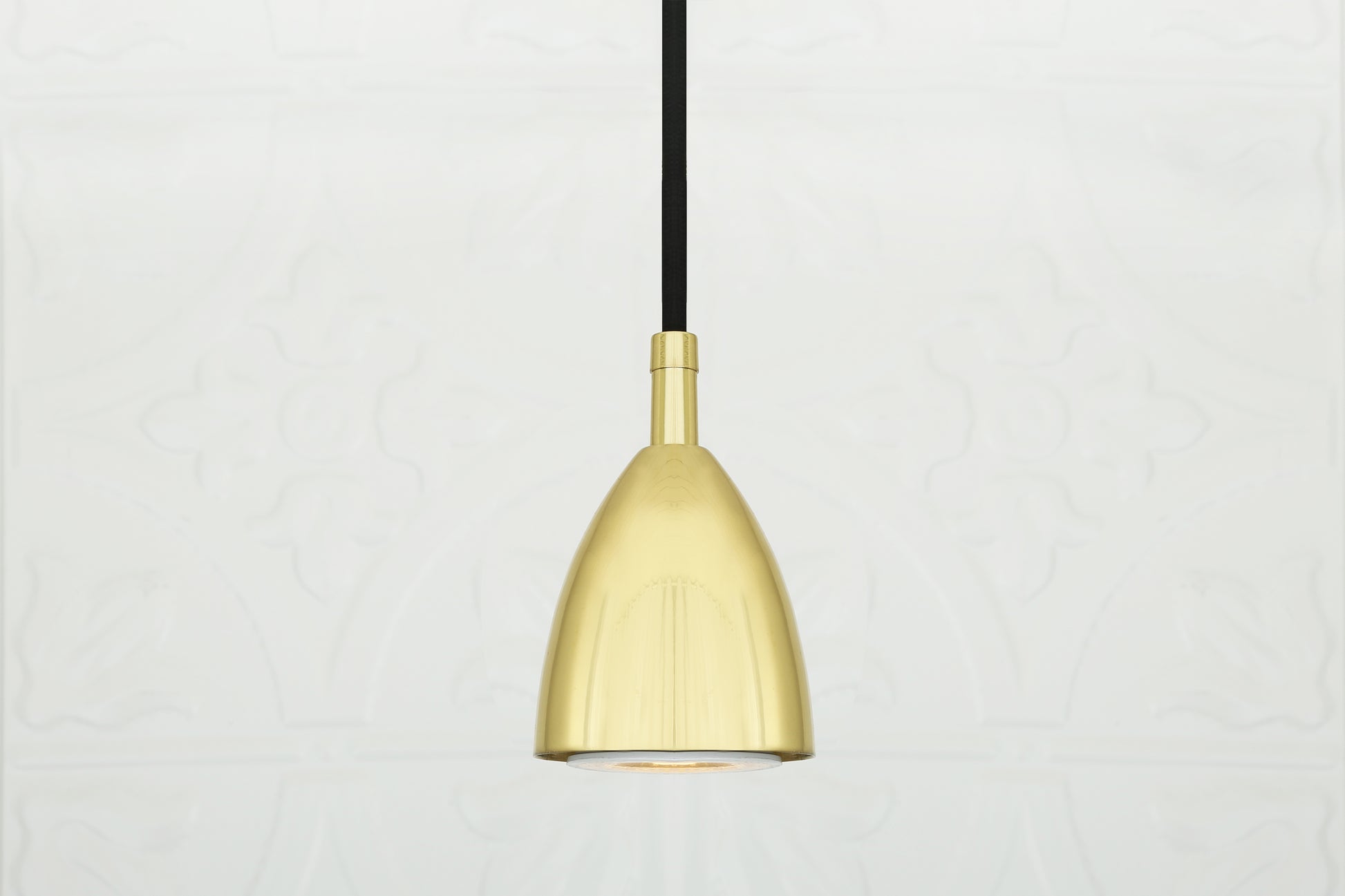 The Lainio pendant light by Mullan Lighting is a modern pendant with a nose cone shape, under which an LED GU10 spotlight bulb is discreetly housed.