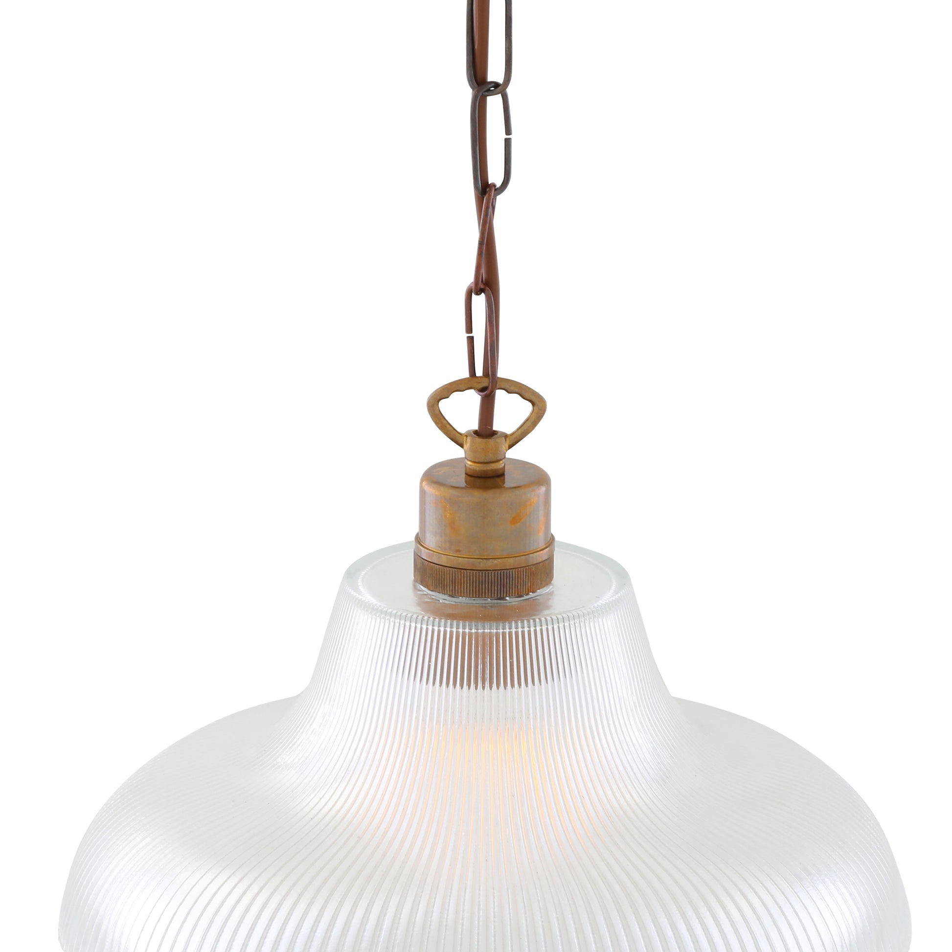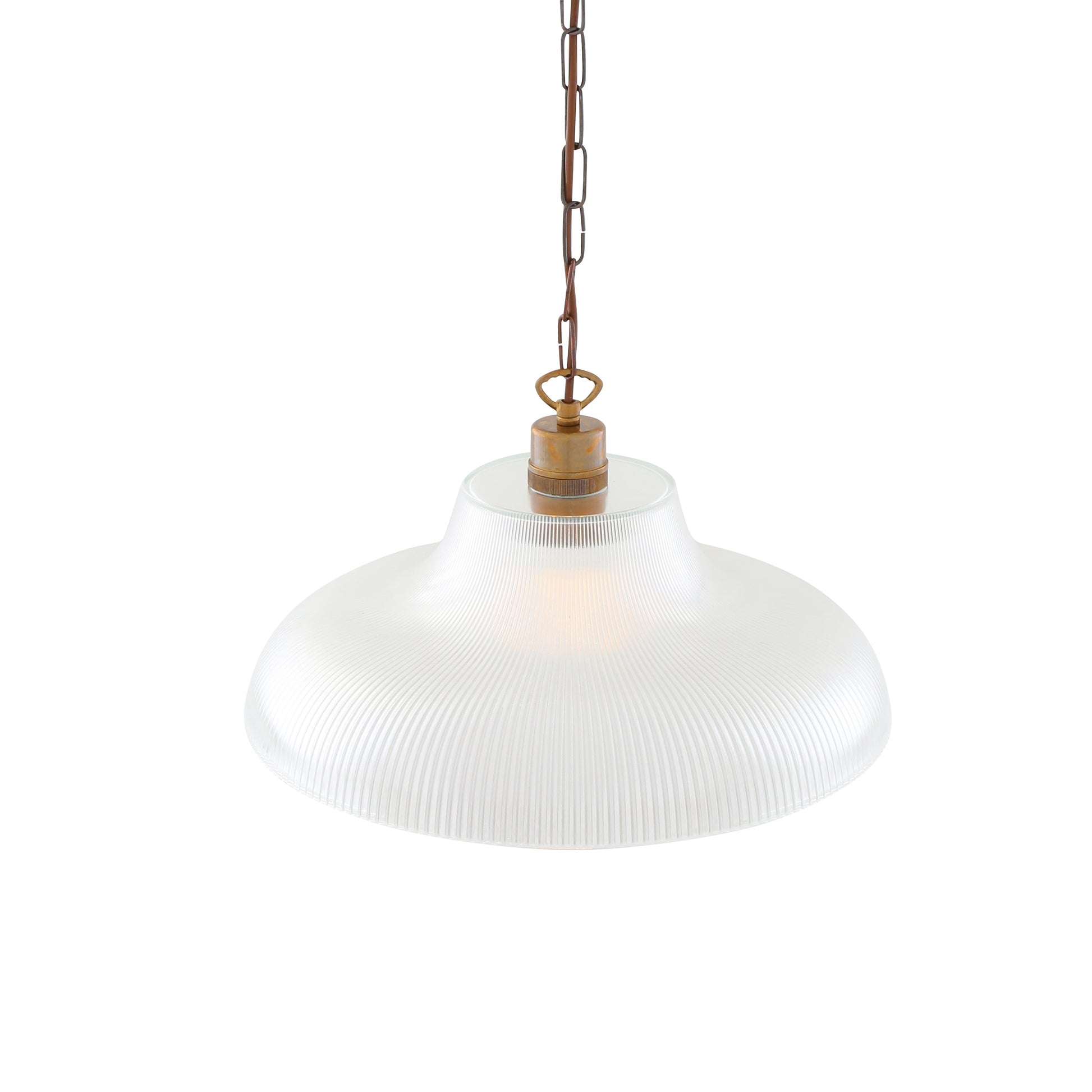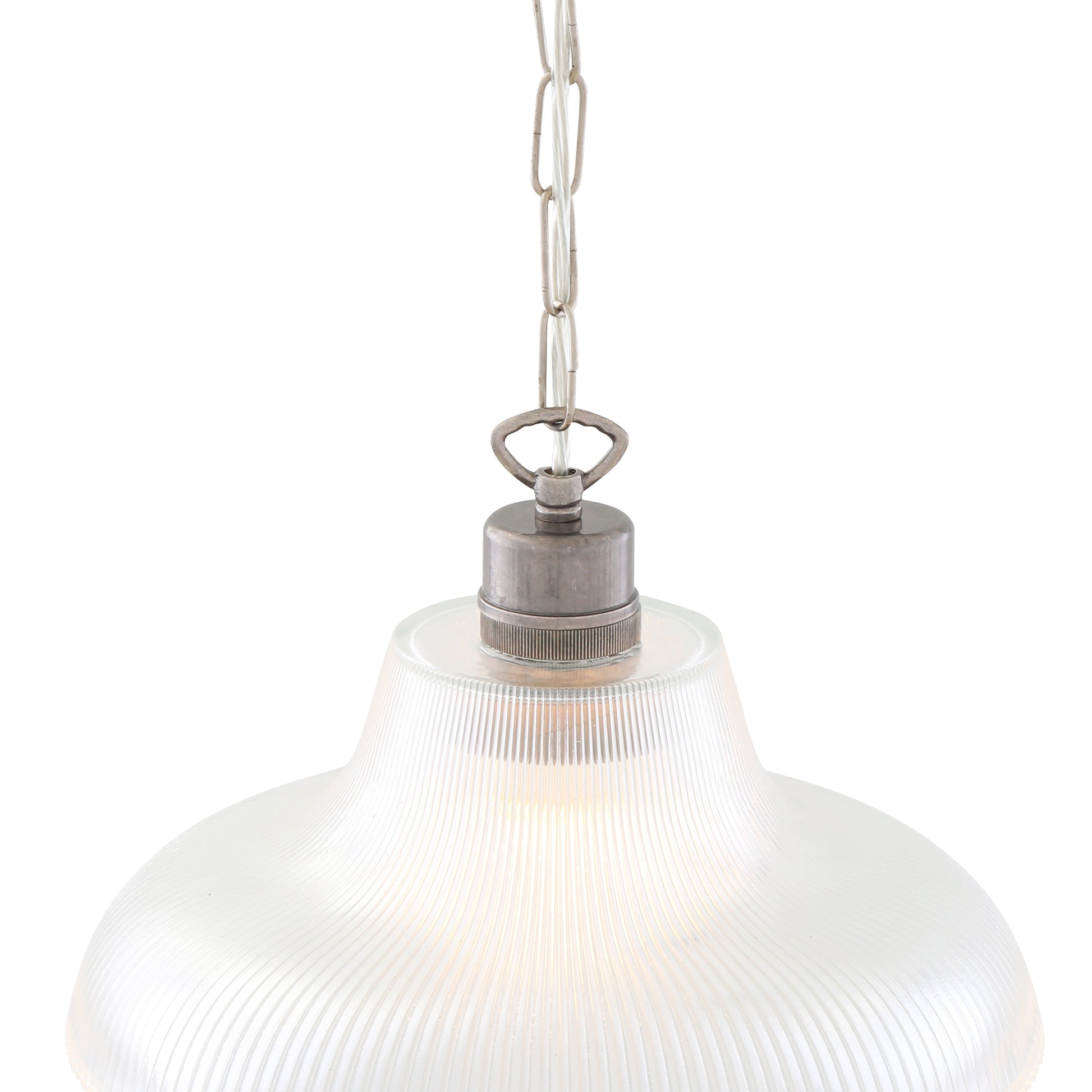 Suspended by a simple chain, this industrial ceiling fixture features a prismatic glass shade which refracts and amplifies light providing a great central lighting source to your space.