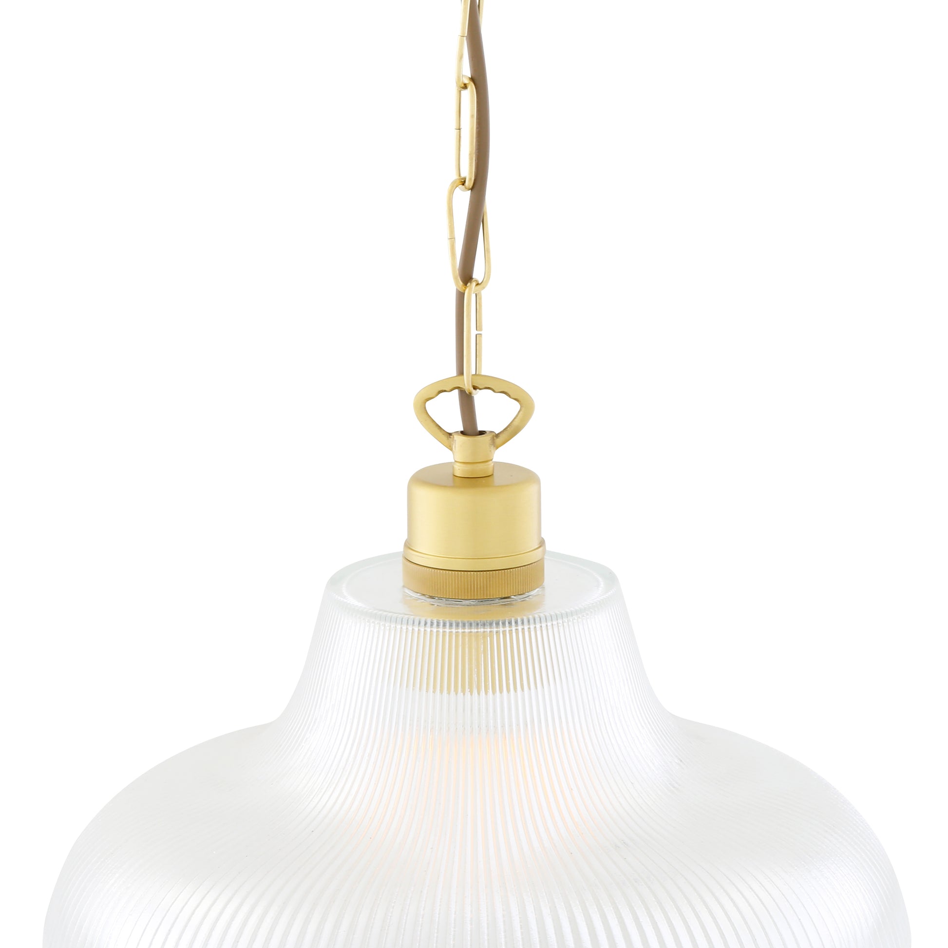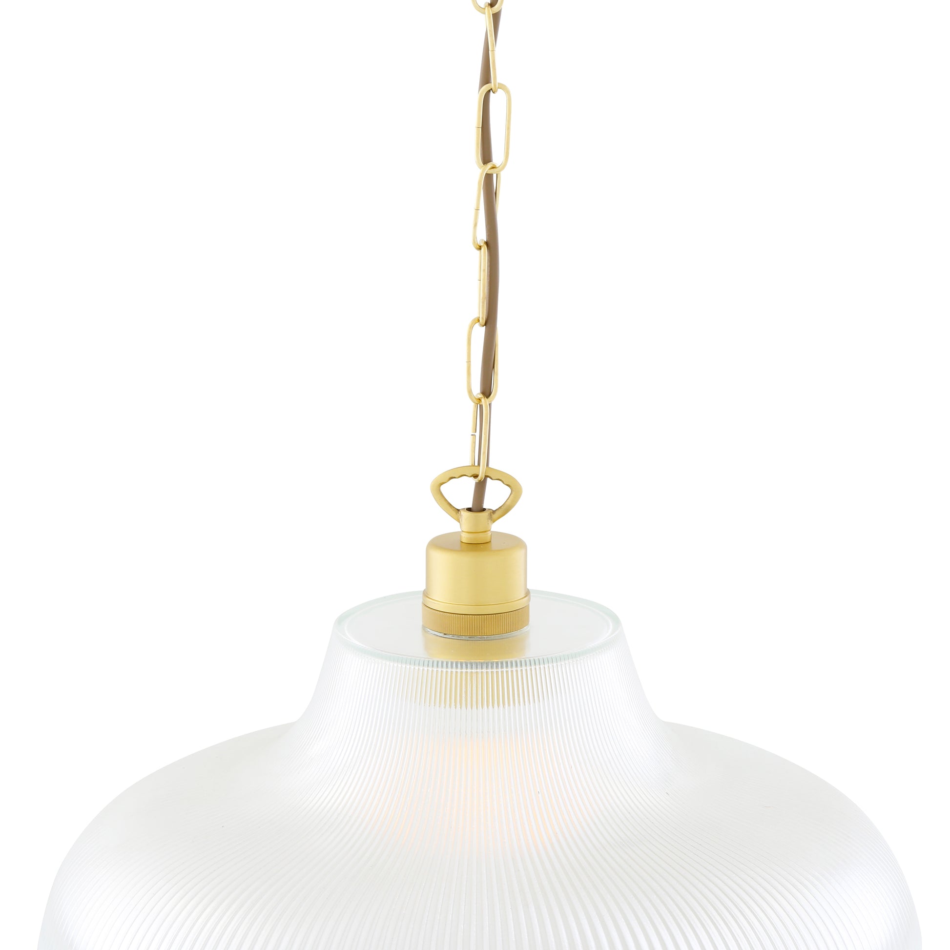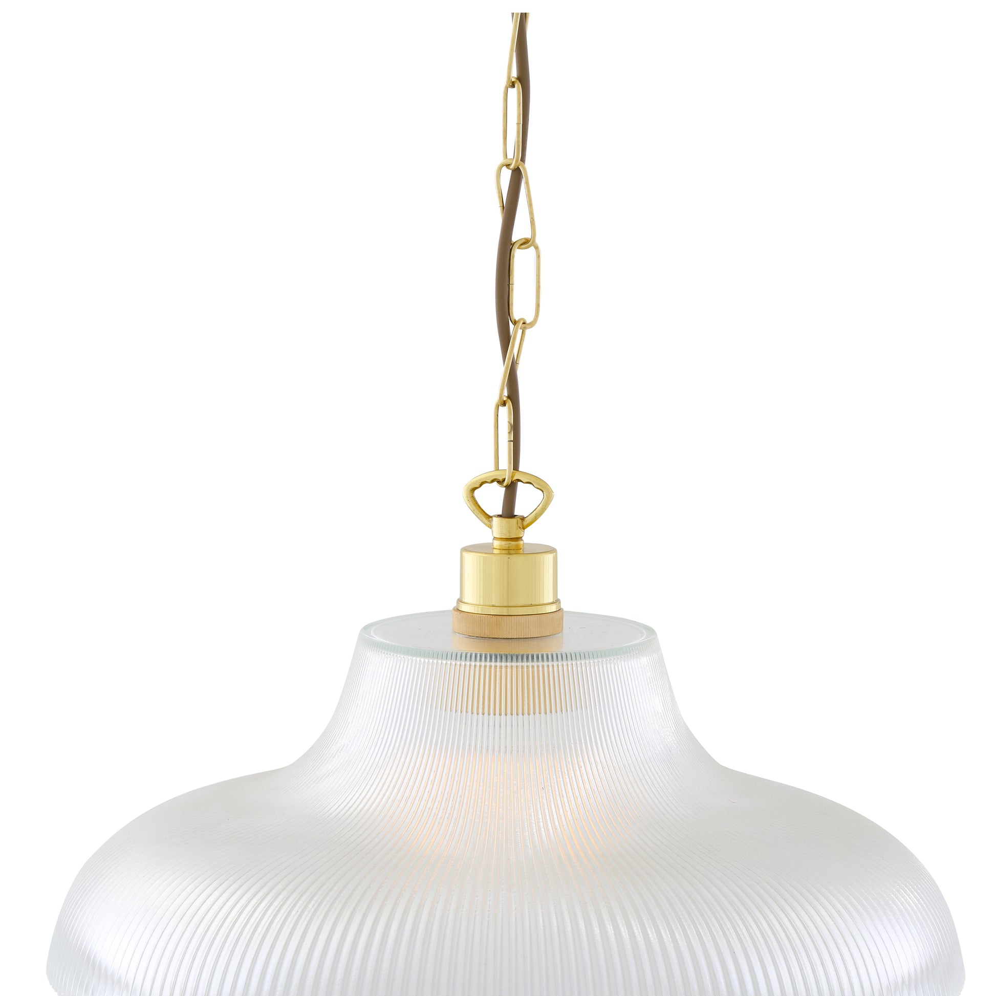 Suspended by a simple chain, this industrial ceiling fixture features a prismatic glass shade which refracts and amplifies light providing a great central lighting source to your space.