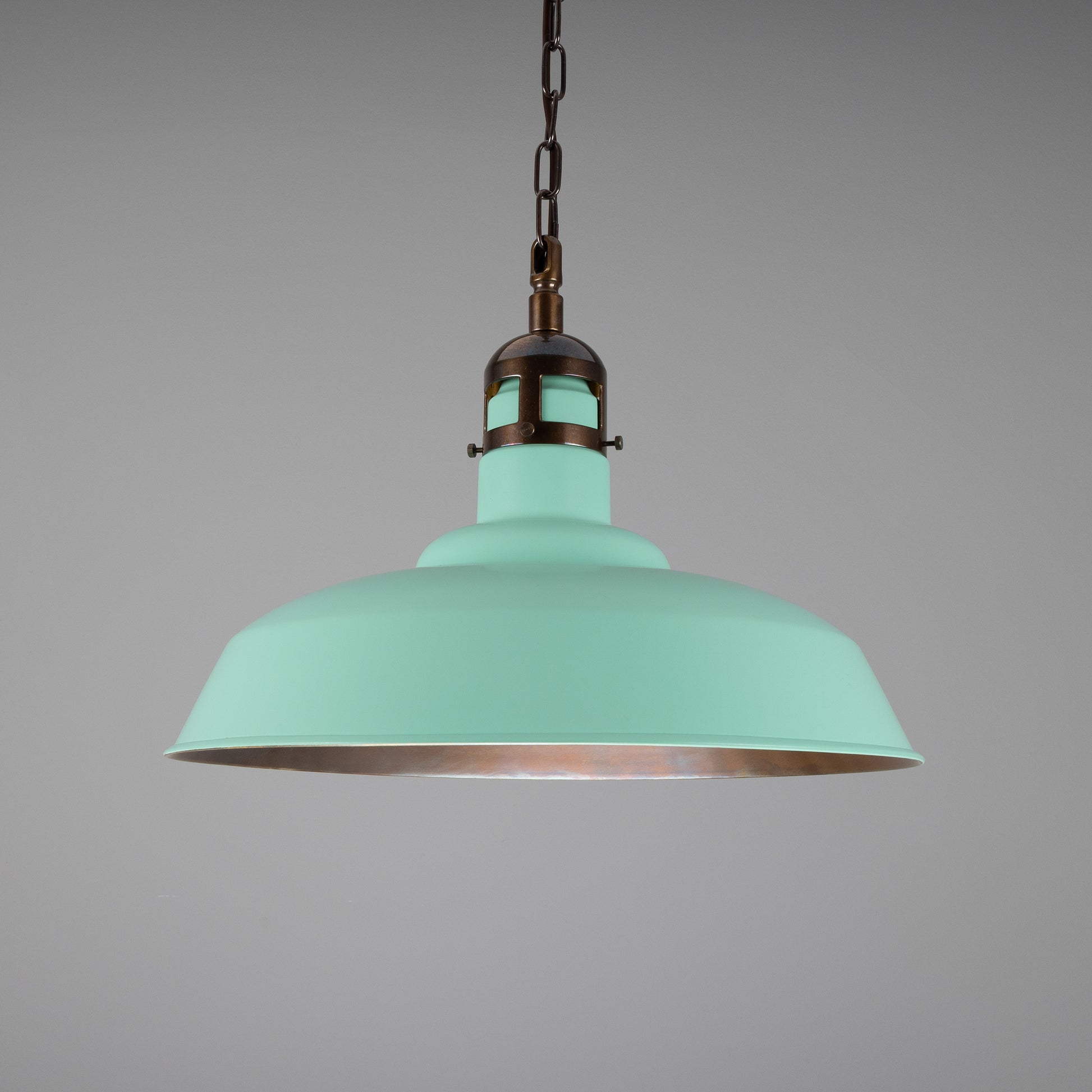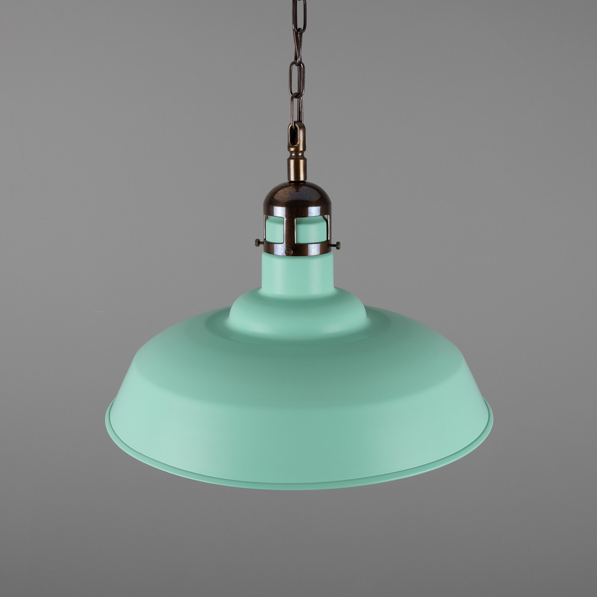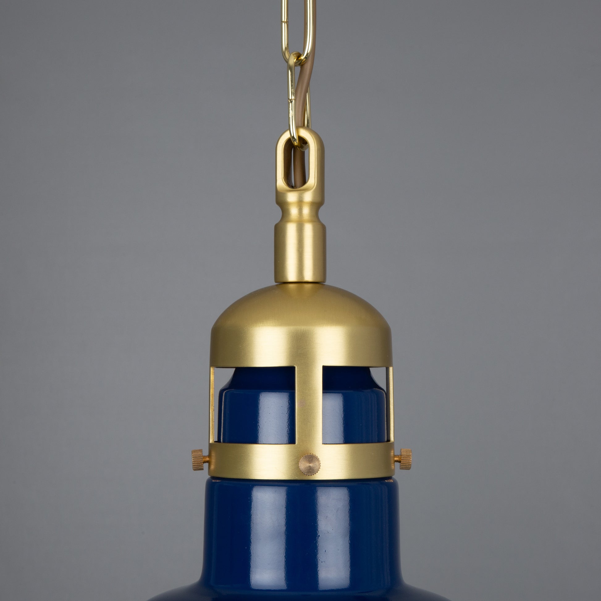 The sapphire blue colour finish is striking against the brass cap feature. Available is four beautiful brass finishes, the Matlock factory-style pendant can suit a range of interior aesthetics.