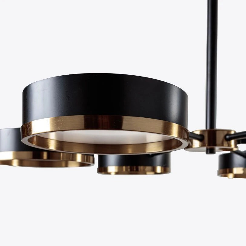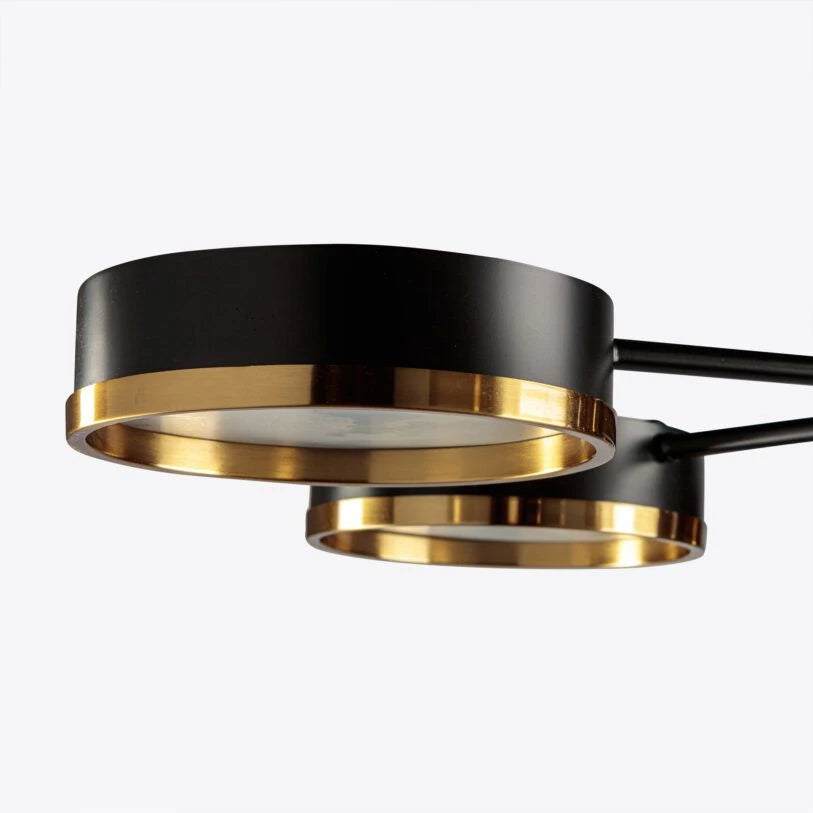 The Moscow Chandelier by Pure White Lines is a striking modernist statement light that brings mid-century inspired design to contemporary interiors with effortless clarity. Featuring six frosted glass disks that softly diffuse illumination, this chandelier creates a warm and inviting ambient glow that enhances the atmosphere without glare. Each glass disk is beautifully rimmed in brass and set upon sleek black iron spokes, forming an elegant radial profile that balances industrial smartness with graceful proportions.