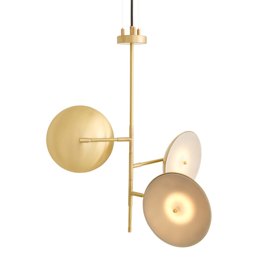 The Oola chandelier, by Mullan Lighting, is a modern brass chandelier that features three brass dishes with light diffusers. From a decorative ceiling rose a brass tube is suspended vertically with three arms intersecting in descending order near the bottom of the tube.