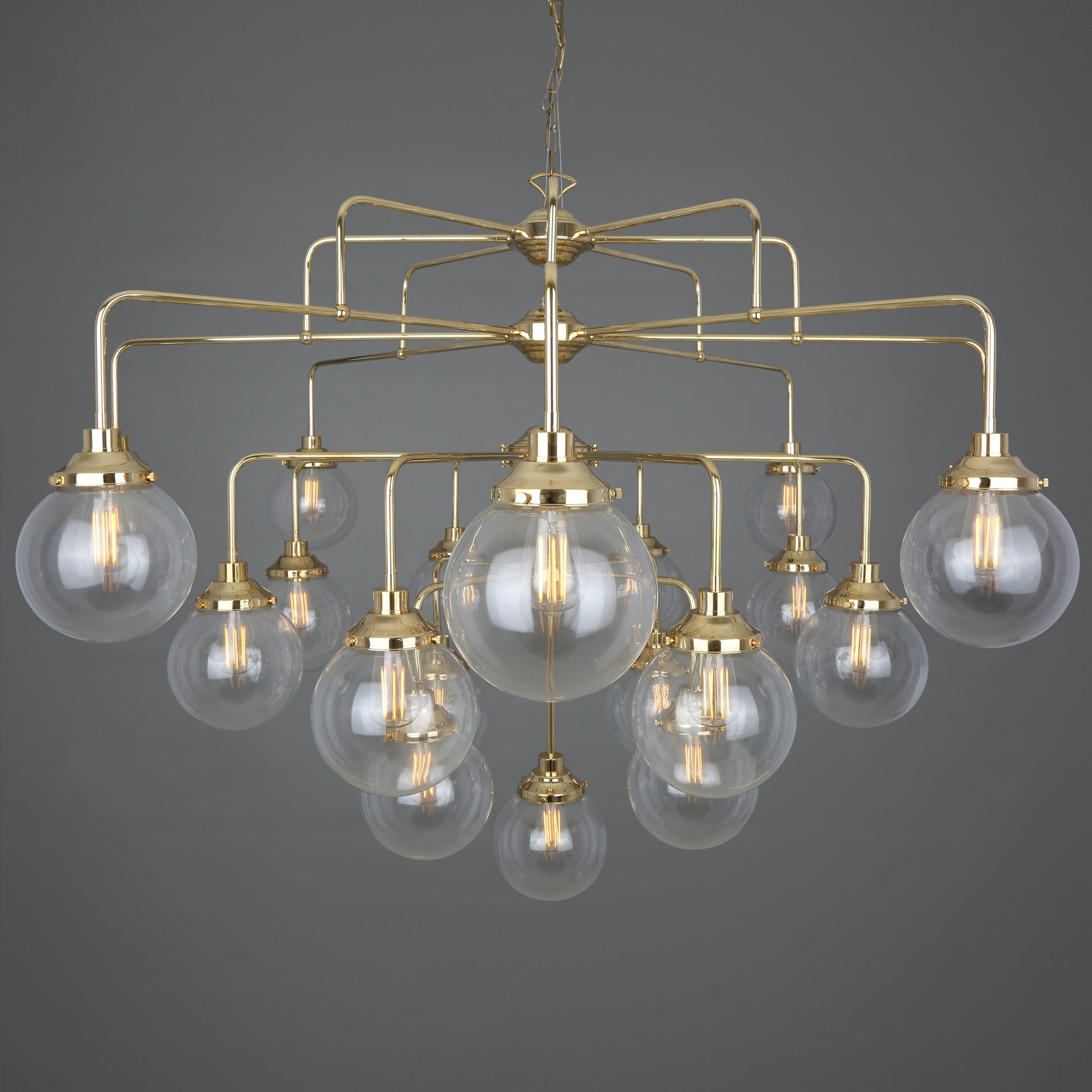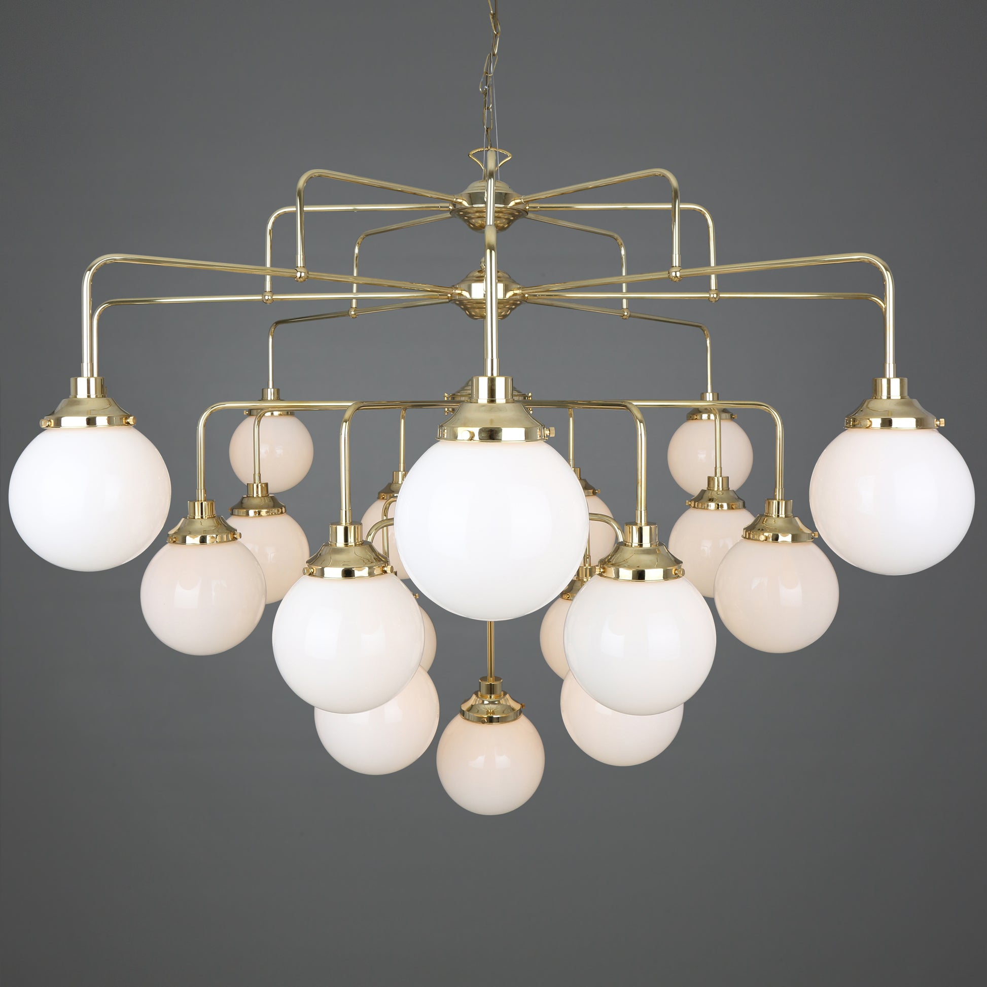 The four-tier Rome chandelier by Mullan Lighting is an impressive Mid-century design. Featuring 21 glass globe lights, this show stopping brass chandelier is the largest design in the Rome lighting collection. Its glass globes are available to order in clear or opal design.