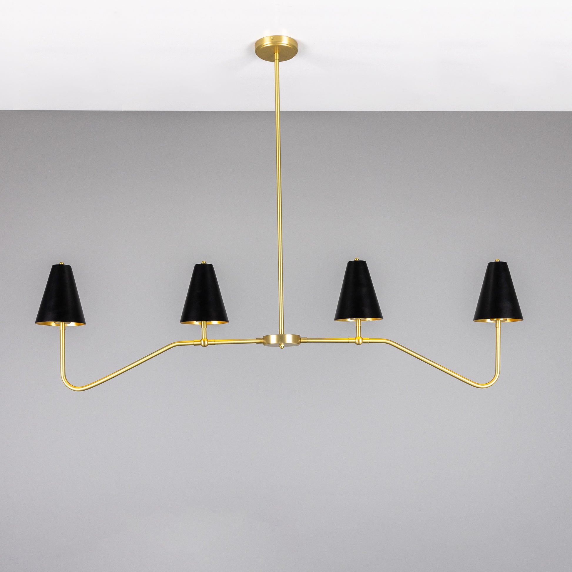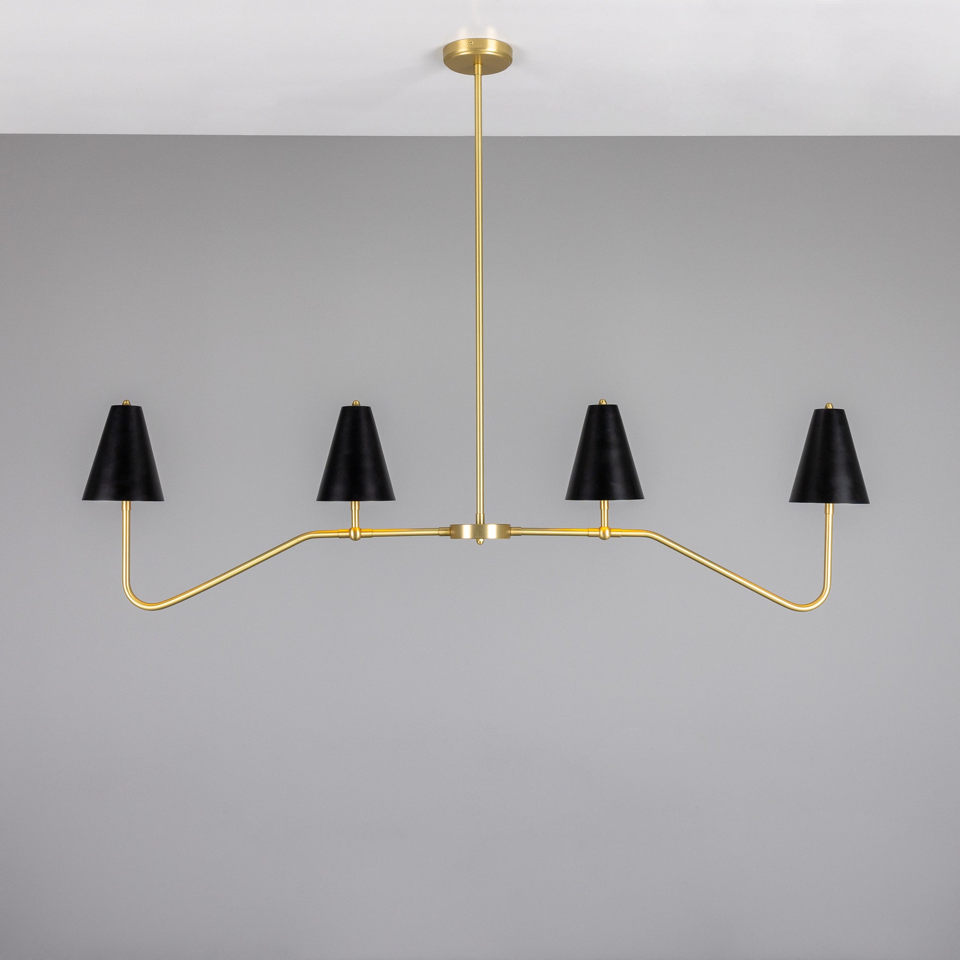 A central brass tube descends from its ceiling rose, holding a cylindrical centre from which two brass arms extend horizontally in linear fashion. Each arm supports two lights and each of the four lights are covered by a brass cone lamp shade.