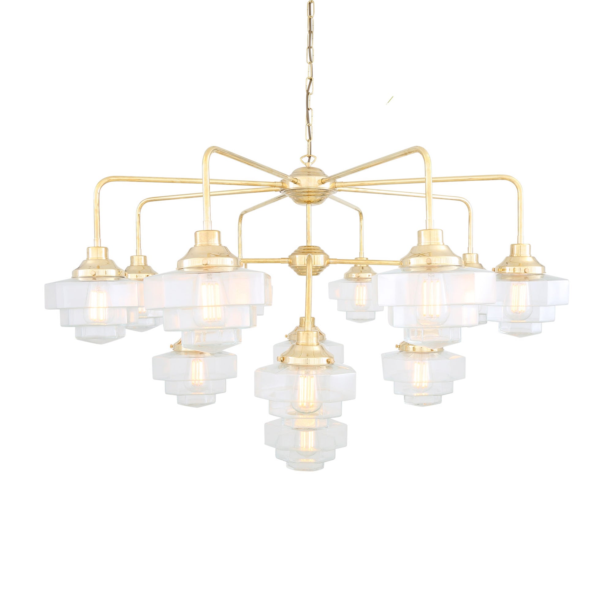 The Siena chandelier is made up of 13 Art Deco glass shades, adding an elegant antique touch to interior spaces.