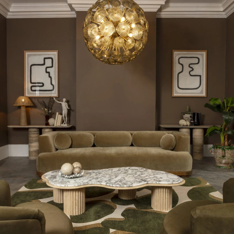 The Vicenza Sputnik Chandelier by Pure White Lines brings a playful yet refined spirit to your interiors, rooted in mid‑century and space‑age design influences. At the heart of this collection are the Vicenza Sputnik lights — striking ceiling fixtures inspired by the organic silhouette of a dandelion, where clusters of coloured glass elements radiate outward from a central brass‑finished frame to create a dynamic, sculptural form.
