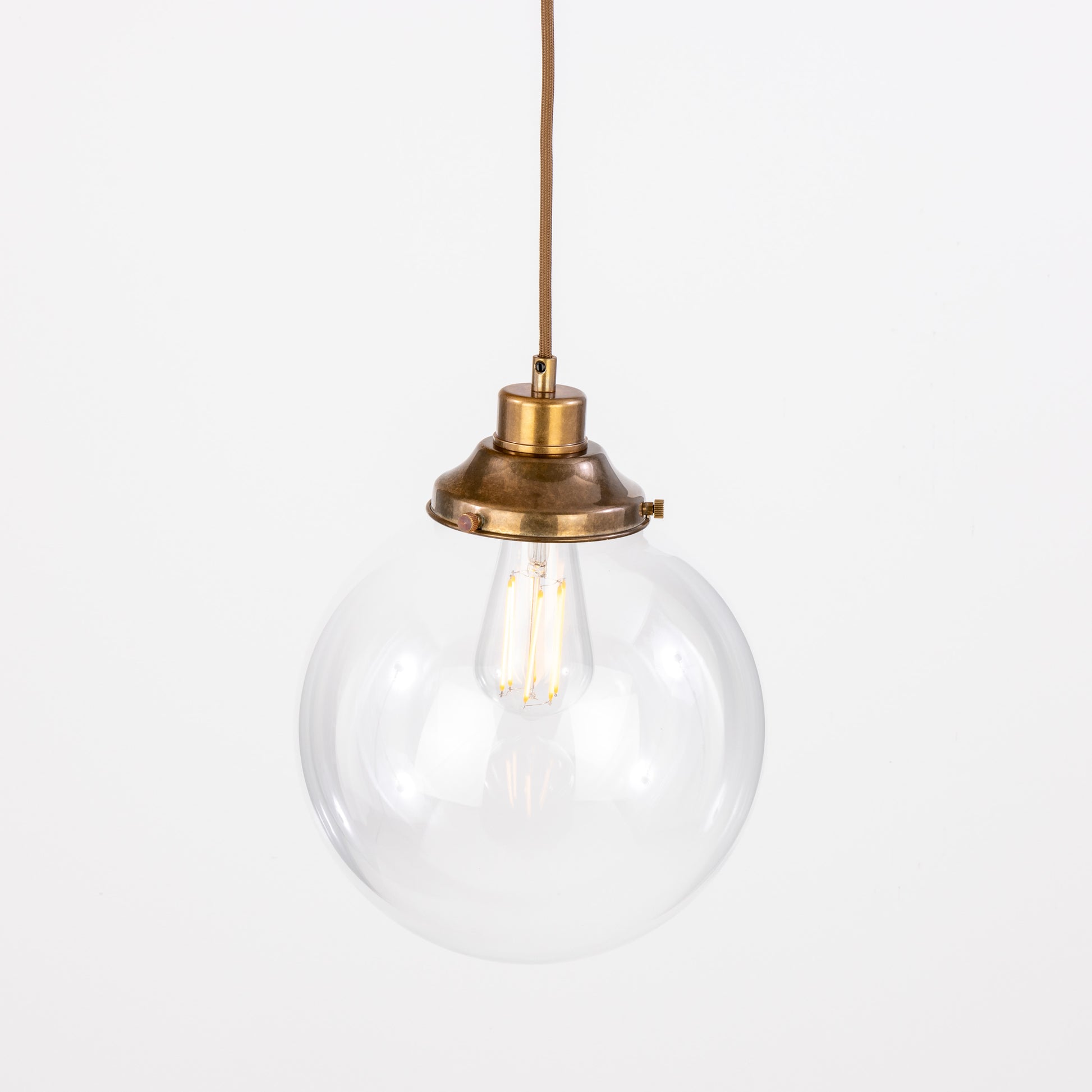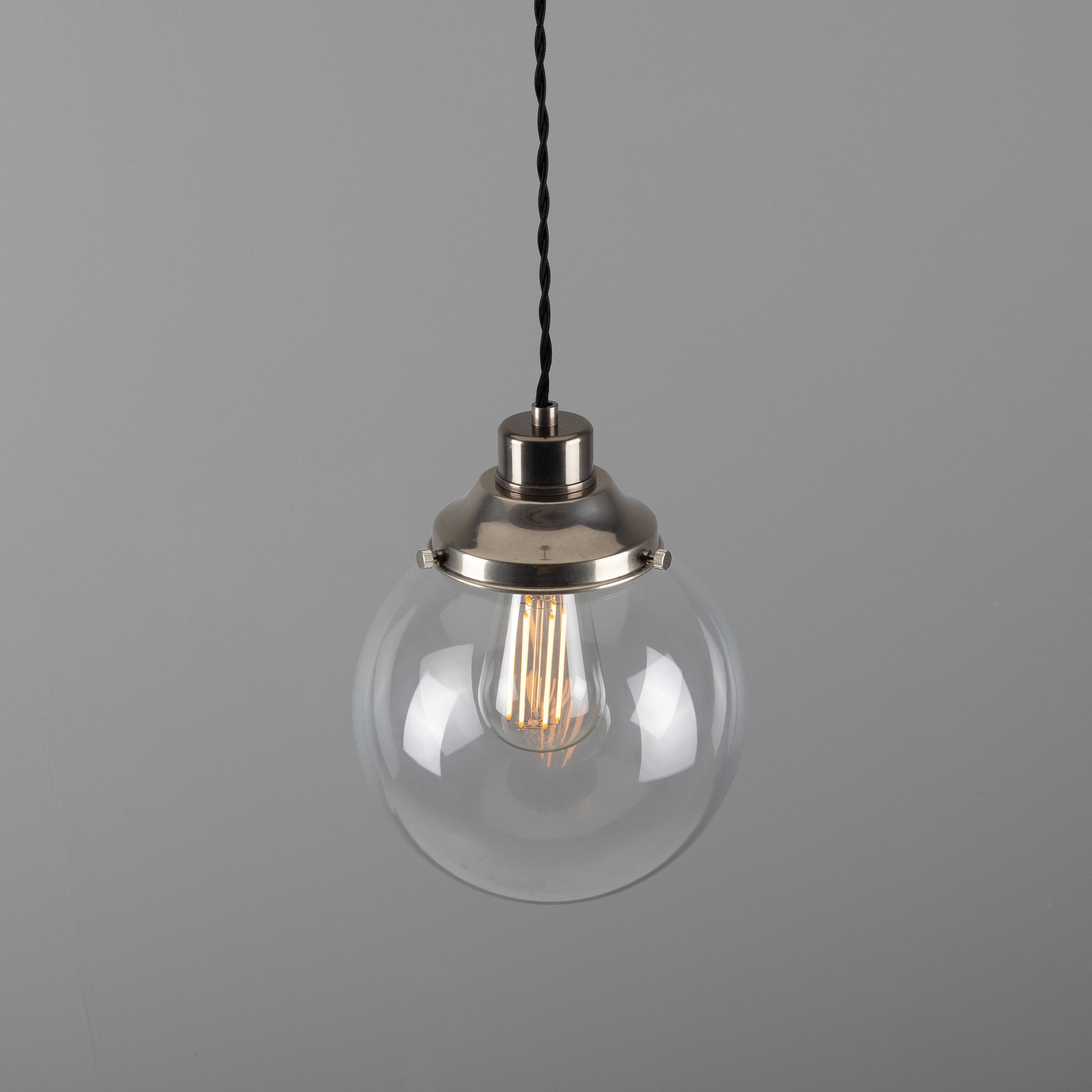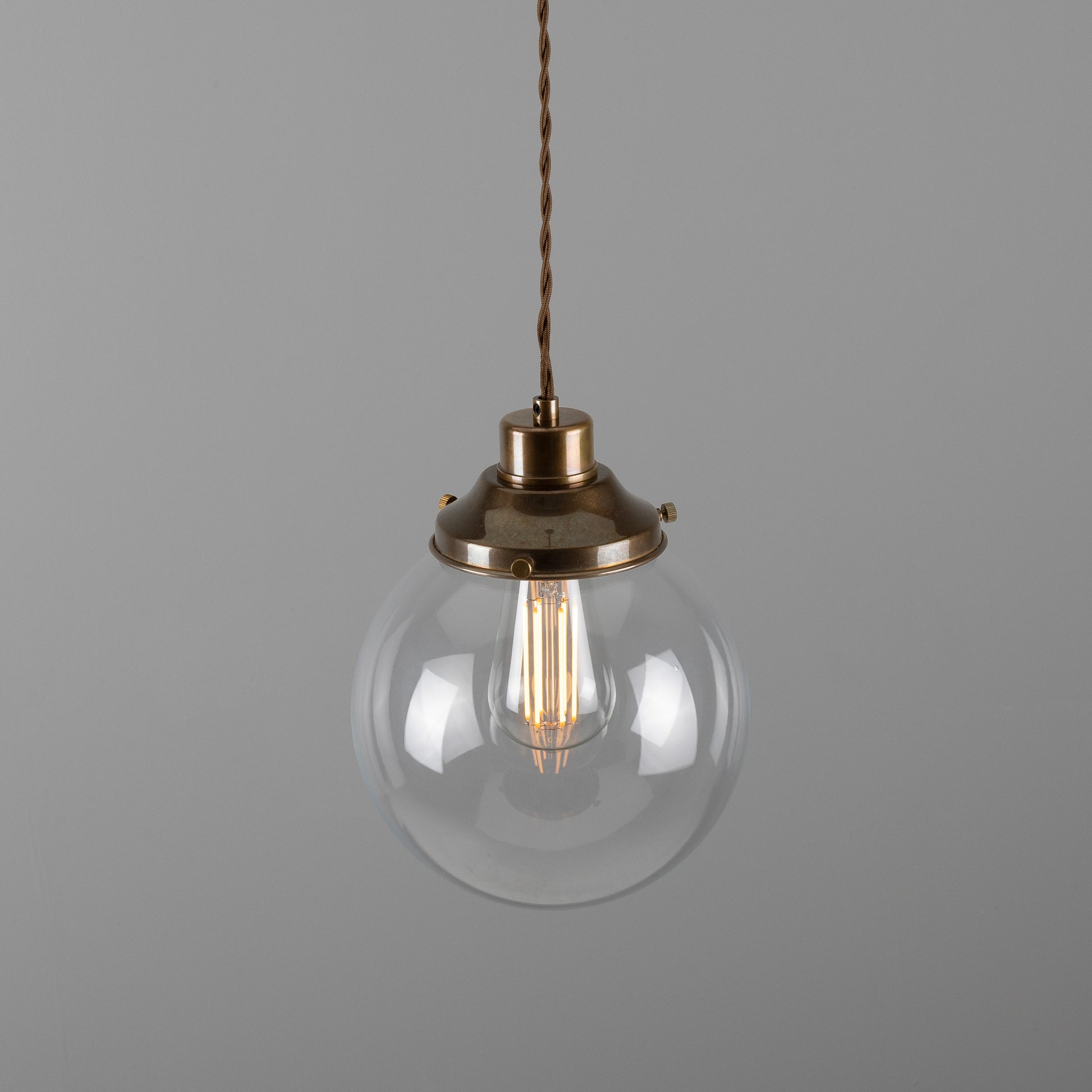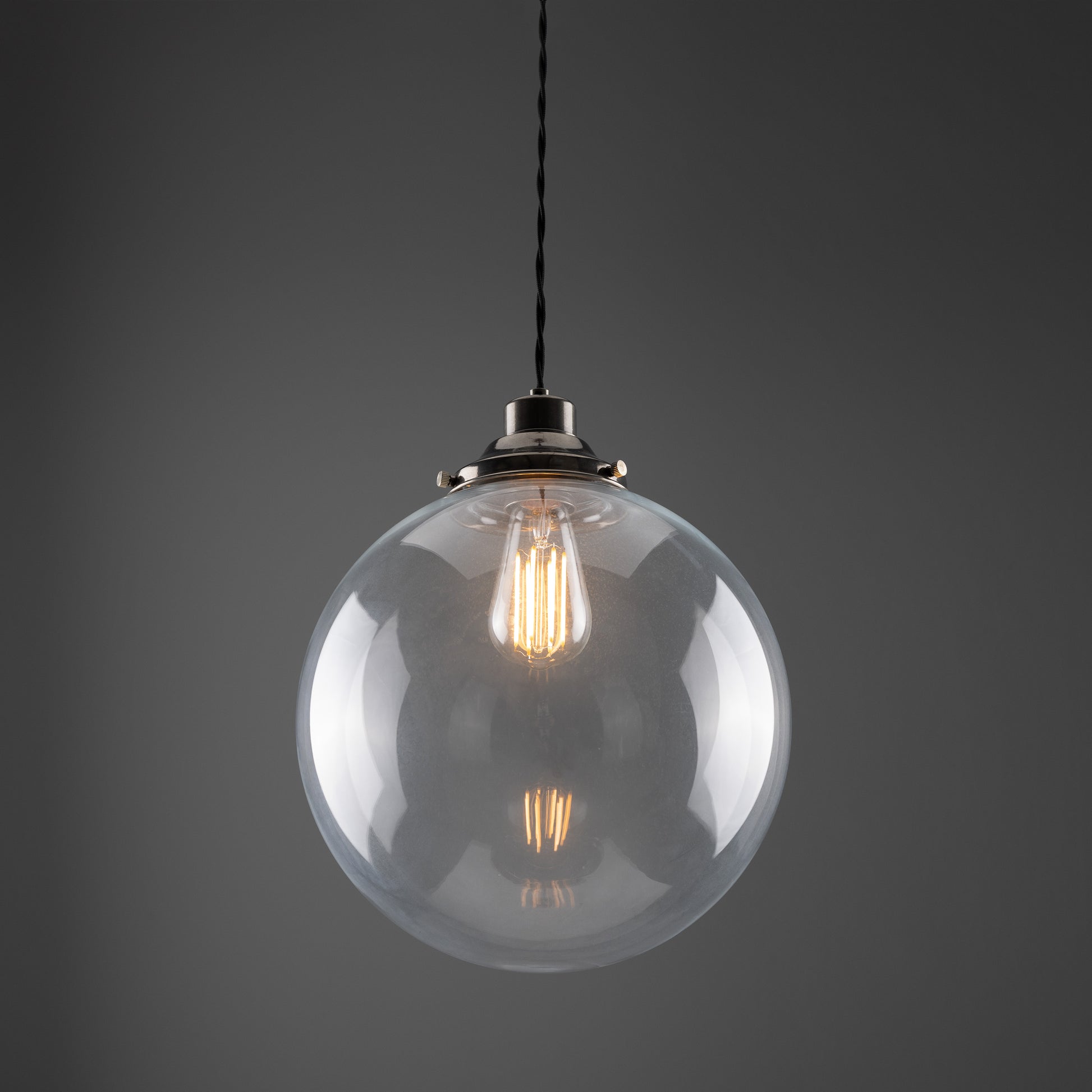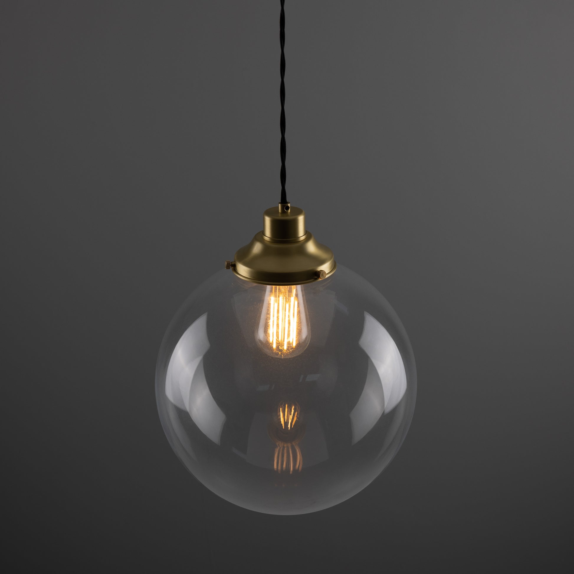 The Virginia clear globe pendant by Mullan Lighting is an industrial-inspired pendant light designed to be the focal point of any room. A vintage gallery supports a large, clear glass globe that subtly diffuses light and softens its harshness in its immediate environment.
