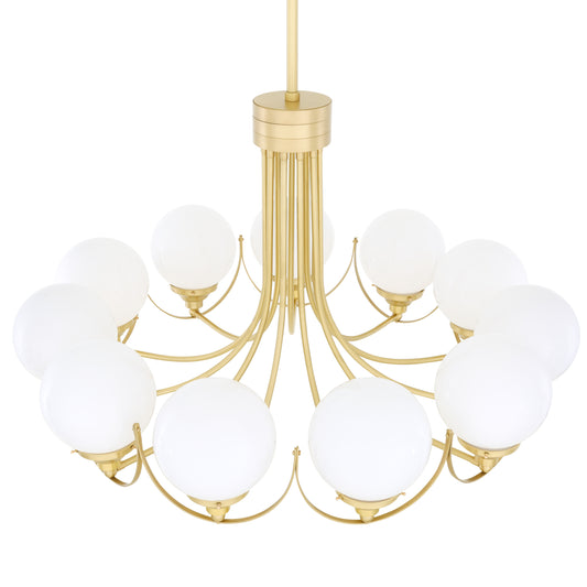 The Wilmot is an impressive globe chandelier with 11 arms by Mullan Lighting. Each arm descends from a central body and curves outwards in a radiant pattern. At the end of each arm a brass gallery - attached to a ball joint - holds a 20cm glass globe in an upward position. The globe can be ordered in clear or opal colour.